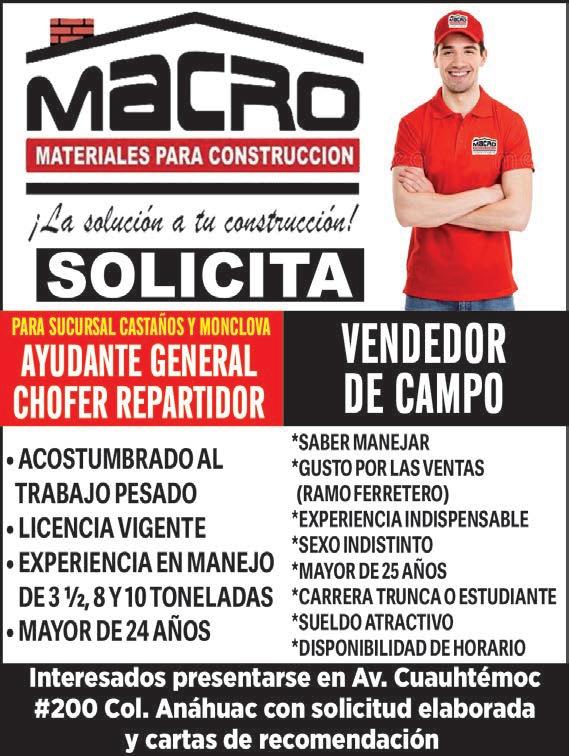 UNETE A NUESTRO EQUIPO. OPERADOR 5TA RUEDA CON LICENCIA FEDERAL TIPO E. OFRECEMOS: ATRACTIVO SUELDO SEMANAL, PRESTACIONES DE LEY, SEGURO DESDE EL PRIMER DIA. 8661412128 COL.DIANA LAURA FRONTERA, COAHUILA. (58488 : 20-Sep : 19-Oct)