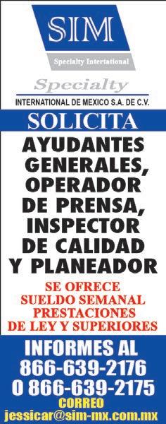 SE SOLICITA PERSONA PARA MANTENIMIENTO GENERAL, SEXO MASCULINO DE 30 A 45 AÑOS, INTERESADOS PRESENTARSE EN PERFITUBOS STEEL (A UN COSTADO DEL 105 BATALLON SOBRE LIB. CARLOS SALINAS DE GORTARI) CON SU SOLICITUD Y FOTOGRAFIA O COMUNICARSE AL 8666350600/ 8666341284. (58047 : 28-Feb : 08-Mar)