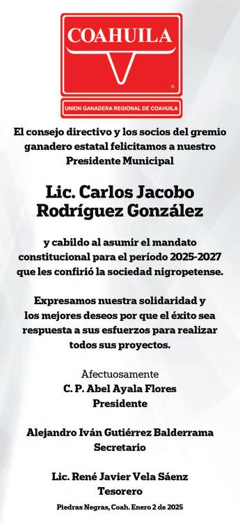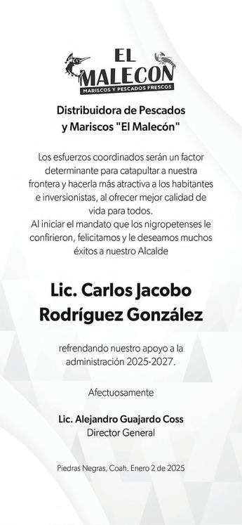 “Arrancamos este 2025 en Monclova en la toma de pro testa de mis amigas y amigos alcaldes de la Región Cen tro-Desierto, en un hecho his tórico para nuestro estado”, destacó Jiménez Salinas. El mandatario estatal reiteró que la mejor manera de honrar la confianza de la gente, es cumpliendo, y abundó que se tienen por hacer grandes obras de infraestructura, como de agua, drenaje, bacheo y construcción de unidades deportivas. Asimismo, destacó que en esta región hay dos pueblos mágicos, Candela y Cuatro Ciénegas, los cuales hay que impulsar y fortalecer.