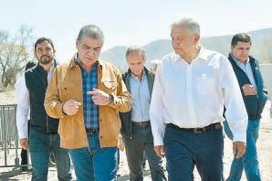 En gira de trabajo por la Comarca Lagunera, el goberna- dor Miguel Ángel Riquelme Solís acompañó al Presidente Andrés Manuel López Obrador y al gobernador de Durango, Esteban Alejandro Villegas Villarreal, en el recorrido de supervisión de la presa derivadora del proyecto “Agua Saludable para La Laguna”. En el ejido Sapioriz, perteneciente a Lerdo, Durango, los mandatarios federal y estatales revisaron los avances de dicho proyecto, el cual garantizará el abasto de agua de calidad para todos los habitantes de la Comarca Lagunera. Al término de la visita del Presidente de la República, el gobernador Miguel Riquelme mencionó que ambas entidades, así como el Gobierno Fe-