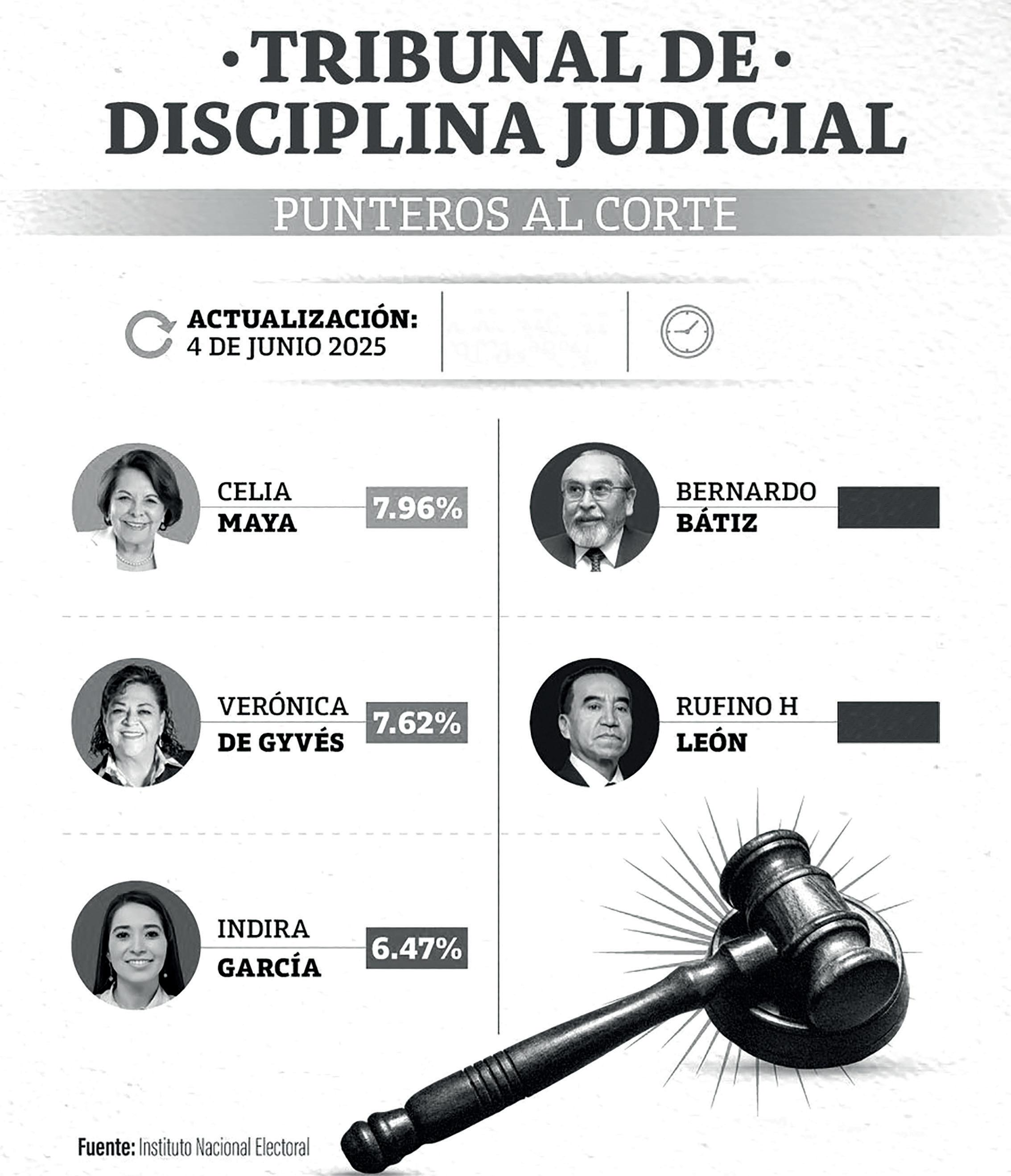 no al Gobierno en el Consejo de la Judicatura Federal (CJF), aventaja en los cómputos de votos para ser los nuevos integrantes del Tribunal de Disciplina Judicial (TDJ). En el caso de Maya García, fue candidata a la Guber-
