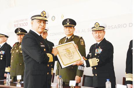 z Conocido entre sus subalternos como “gran maestro”, el almirante Raymundo Pedro Morales Ángeles (izq.) es cercano a su predecesor José Rafael Ojeda Durán, quien en la foto le entrega un reconocimiento.