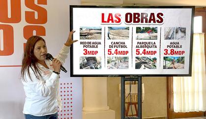 Mónica Escalera, candidata de Movimiento Ciudadano a la alcaldía de Múzquiz, mostró a los miembros de la prensa cada una de las obras que la empresa Aikin, propiedad de Jacobo y Efrén Rodríguez