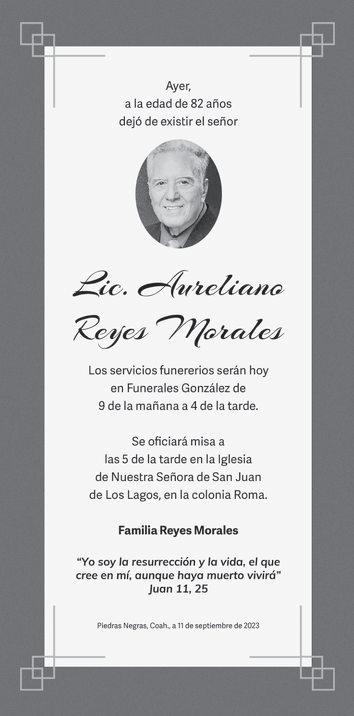 Ayer falleció Aureliano Reyes Morales, quien por varias décadas fue gerente de la Canaco y representante patronal ante la Junta de Conciliación y Arbitraje… Integrante de una familia muy destacada en el ámbito deportivo, Reyes Morales también fue catedrático del Instituto Tecnológico de Piedras Negras y un hombre institucional en la cámara empresarial que vio desfilar a un buen número de presidentes y encaminar proyectos de mejora constante en ese organismo…