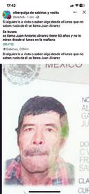A través de redes sociales, familiares de Juan Antonio Álvarez, de 50 años de edad, pidieron el apoyo para poder ubicarlo, ya que es una semana ya que aún no ha establecido comunicación con su seres queridos, por lo cual temen por su integridad.