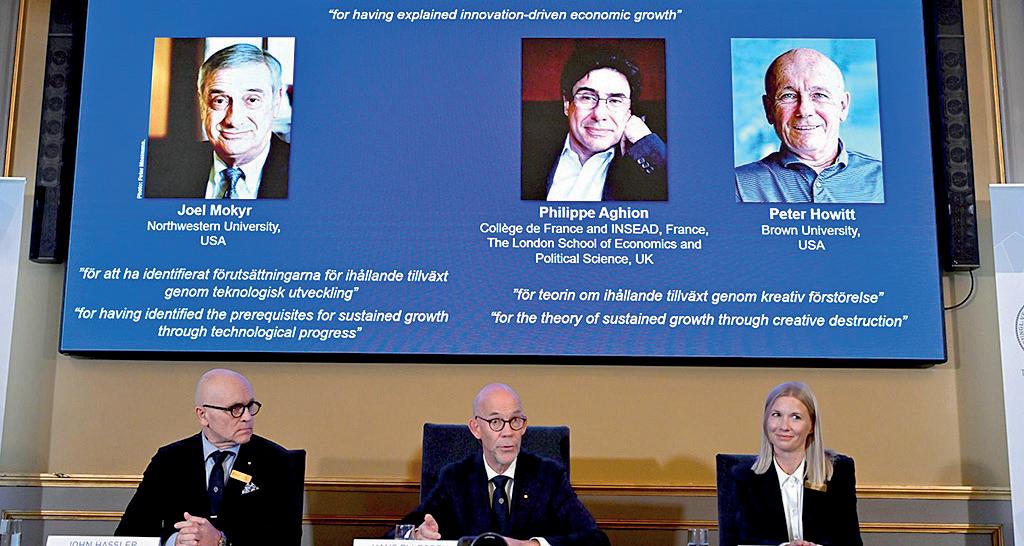 z Miembros de la Real Academia de Ciencias de Suecia presentaron a los ganadores del Nobel de Economía: el estadunidense Joel Mokyr, el francés Philippe Aghion y el canadiense Peter Howitt.