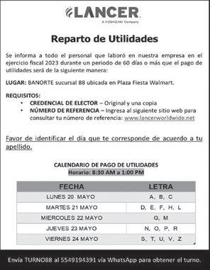 A todas las personas que laboraron 60 días o más durante el año de 2023, favor de acudir a las instalaciones de la Empresa los días 23 y 24 de Mayo en un horario de 3:00 p.m. a 5:00 p.m.