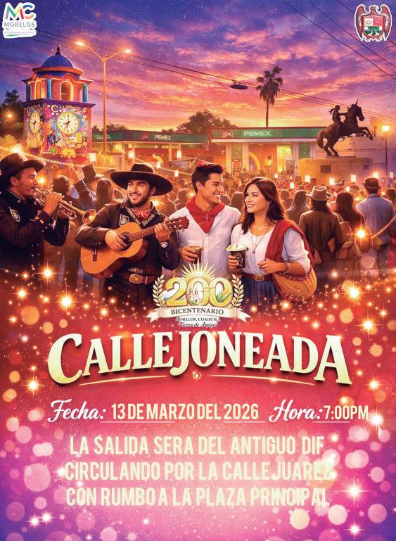 En el marco de los festejos por el 200 aniversario de la fundación del municipio de Morelos, Coahuila, el Gobierno Municipal encabezado por el alcalde Mario Camarillo Zertuche, invita a la ciudadanía a participar en la tradicional callejoneada que se llevará a cabo el próximo 13 de marzo a partir de las 7:00 de la tarde.