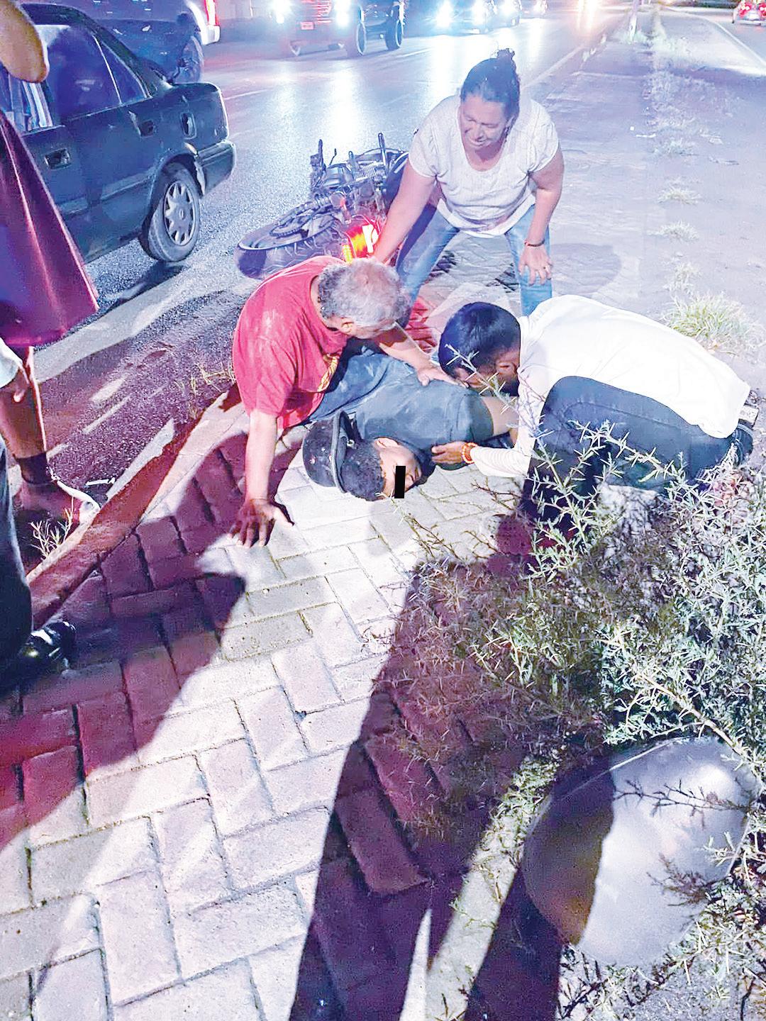 z El motociclista tendido en el suelo luego de sufrir fracturas múltiples tras impactarse contra el camellón y luego contra el pavimento.