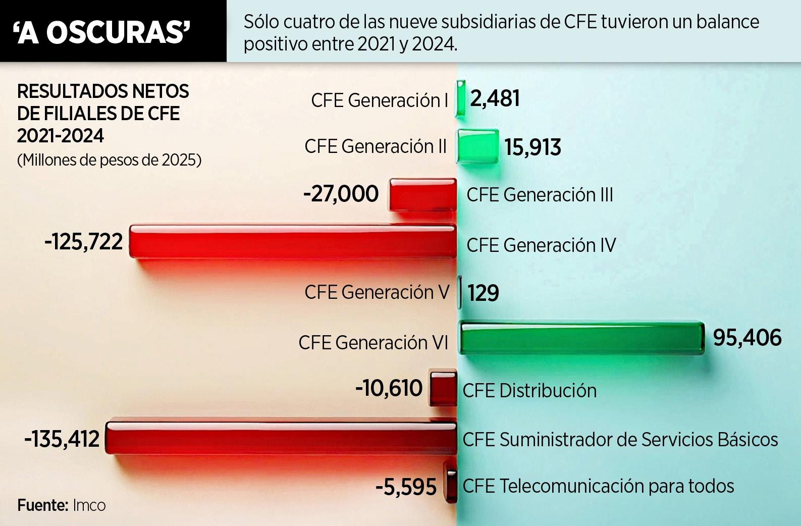 Las 10 empresas subsidiarias de la Comisión Federal de Electricidad (CFE) acumularon pérdidas por 164.3 mil millones de pesos entre 2021 y 2024, de las cuales sólo CFE Suministrador de Servicios Básicos tuvo números rojos de 135.4 mil millones, según el Instituto Mexicano para la Competitividad (Imco).