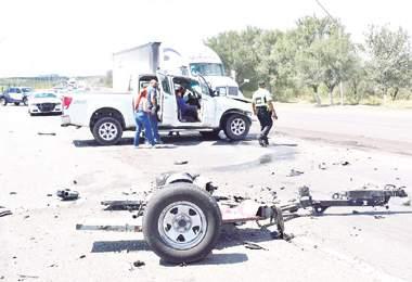El accidente se registró en la mencionada arteria estatal a la altura de las antiguas albercas, donde se vieron involucradas una camioneta Nissan Titan blanca y un Hyundai Elantra negro, así como un dolly que traía otro vehículo.