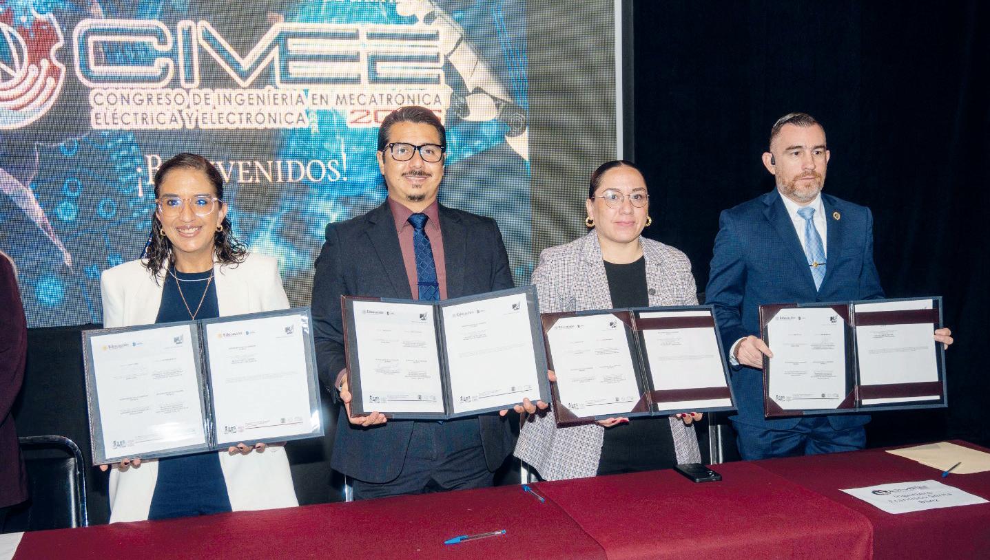 Ania Sánchez, acompañada de la subdirectora académica, Tere Borrego Jiménez; el subdirector de Planeación y Vinculación, Ricardo Martínez Alvarado, y el subdirector de Servicios Administrativos, Emmanuel Flores Villa. Como invitados especiales, se dieron cita el asesor facultativo del evento, Javier de la Peña Martínez, así como Sofía Ortiz Flores, presidenta del CESA, además de los responsables de la organización: Bernardo Farías, presidente del capítulo estudiantil de Electrónica, junto con su equipo de trabajo, así como el asesor facultativo de Electrónica, Pedro Quintanilla Contreras. Asimismo, Eduardo Ramírez Martínez, presidente del capítulo estudiantil de Mecatrónica y su equipo de trabajo, con sus asesoras, Ana Gabriela Gómez Muñoz y Karla Ivonne Fernández Ramírez.