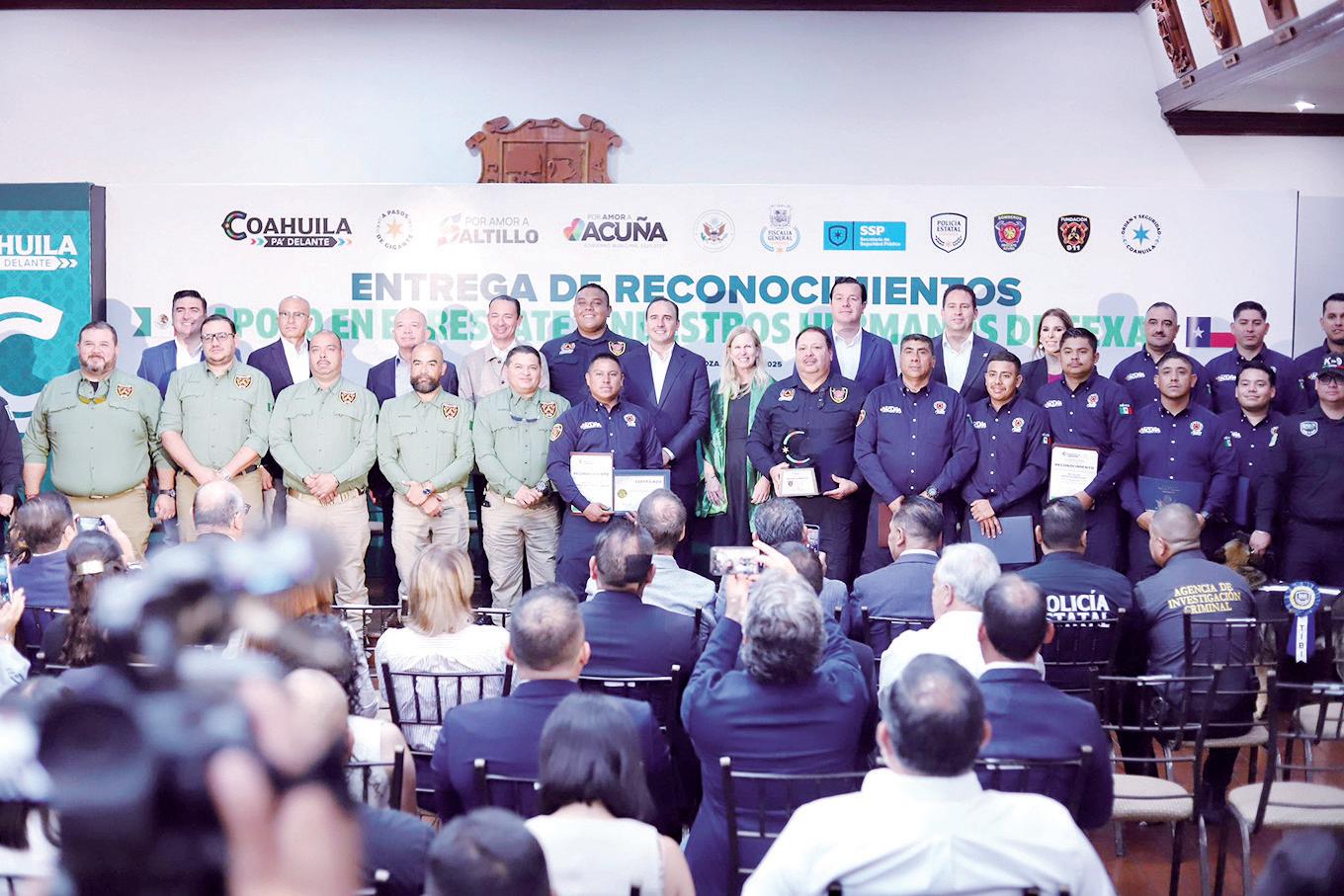 El gobernador Manolo Jiménez Salinas y Melissa Bishop, cónsul de EU en Monterrey, entregaron ayer reconocimientos de gratitud a rescatistas de Acuña, y a los binomios caninos que colaboraron en las inundaciones de Texas, ubicando 13 cuerpos.