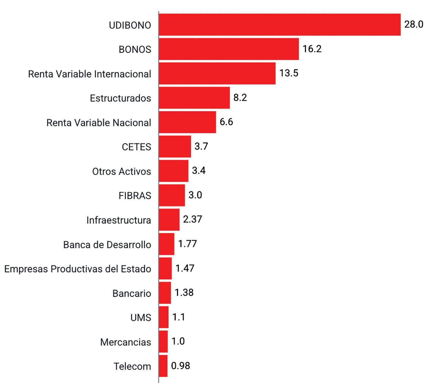 z La mayoría de los recursos que administran las Afores en el país están invertidos en Udibonos, bonos de deuda emitidos por el Gobierno mexicano que están indexados a la inflación.