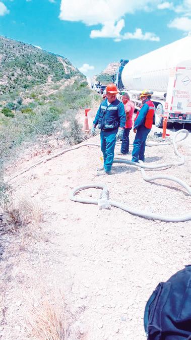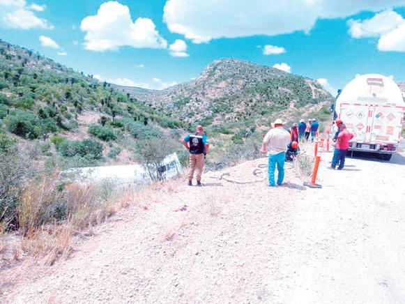z PC y personal de la empresa Solensa, propiedad de la unidad volcada en el kilómetro 158 de la estatal No. 20, Múzquiz-Boquillas, llevan realizando maniobras dos días para rescatar la pipa accidentada en la sierra de Múzquiz.