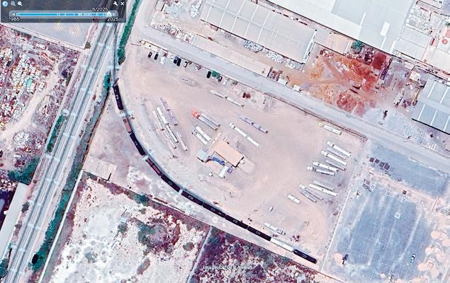 Imágenes satelitales del predio cateado el viernes pasado, que van de abril de 2023 a junio de 2025. Se observa la espuela del ferrocarril y cómo esta habría sido ampliada para tener más capacidad de recibir carros tanque. Conforma avanza el tiempo, se incrementa la cantidad de pipas en el sitio. 1 2 3 4