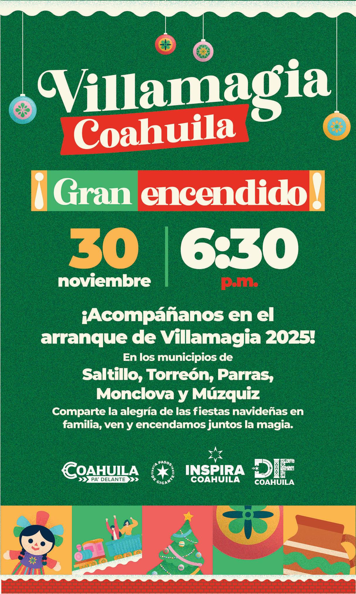 A los pocos días de haber encabezado el desfile revolucionario en Múzquiz, el gobernador Manolo Jiménez Salinas regresa al pueblo mágico para realizar el encendido de Villamagia. Será una acción simultánea que se replicará en punto de las siete de la noche en Saltillo, Torreón, Monclova, y Parras de la Fuente. Este año le ha ido bien a Múzquiz y a su Alcaldesa, Laura Jiménez “Gachupina”. Mediante la cercanía con el Gobierno echado pa´delante han llegado más obras y programas en beneficio de la población, a fin de rescatar al municipio del desastre que dejó Tania Flores.
