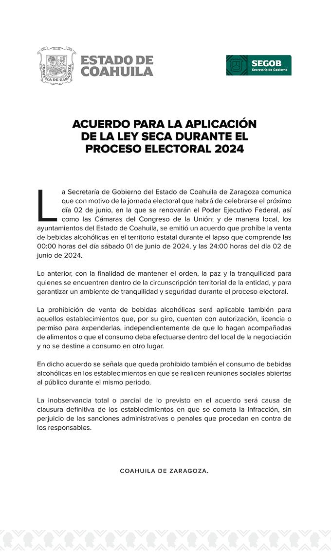 Ayuntamiento en PN, Hermelo Castillón, advirtió que se aplicará la ley seca para todos bares, antros, discotecas, tiendas de abarrotes y depósitos, tiendas de conveniencia, restaurantes y otros establecimientos con licencia para la venta de alcohol a partir de esta medianoche.