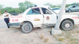Juan Manuel Pérez Galván, de 63 años de edad, fue atendido en el lugar por paramédicos de Bomberos. El accidente se registró en el bulevar República frente a la colonia Villa Fontana hasta donde llegaron los equipos de emergencia para auxiliarlo. El taxista de la línea Correcaminos fue a impactarse contra el poste de alumbrado público propiedad del municipio, luego de perder el control del vehículo. El departamento de Tránsito y Vialidad se hizo cargo del percance y envió el auto al corralón para que este responda por los daños causados al patrimonio municipal. Se estima que el auto sea pérdida total o que ya no esté en circulación, pues se impactó de costado y eso ocasionó afectaciones en todo el lado derecho de la unidad.