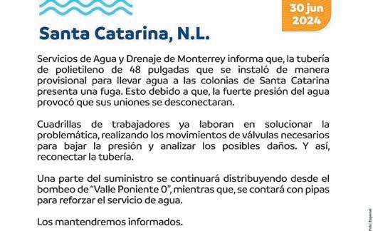 “La tubería de polietileno de 48 pulgadas que se instaló de manera provisional para llevar agua a las colonias de Santa Catarina presentó una fuga”, indica el escrito de AyD, y aclarando que la situación se ocasionó “debido a que la fuerte presión del agua provocó que sus uniones se desconectaran”.