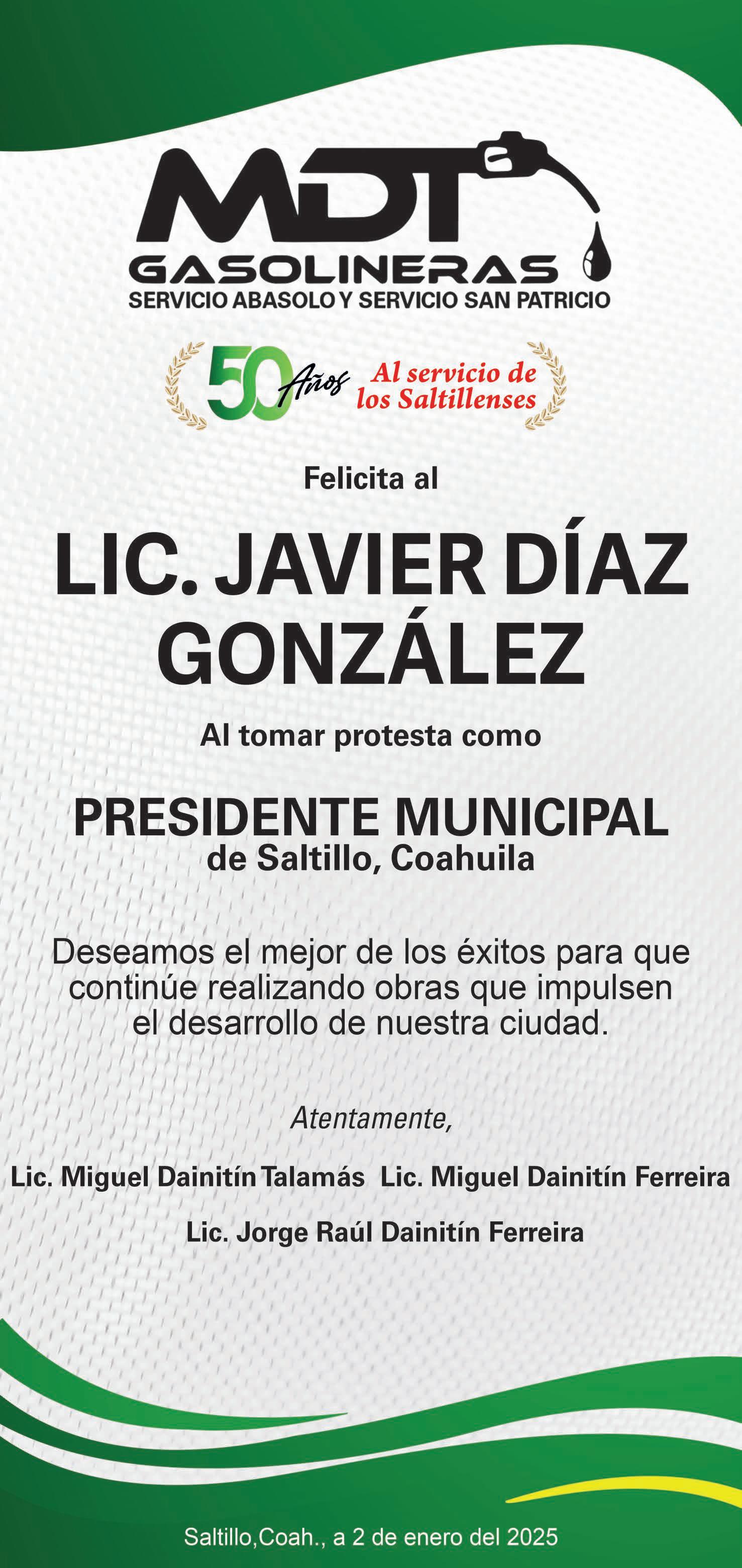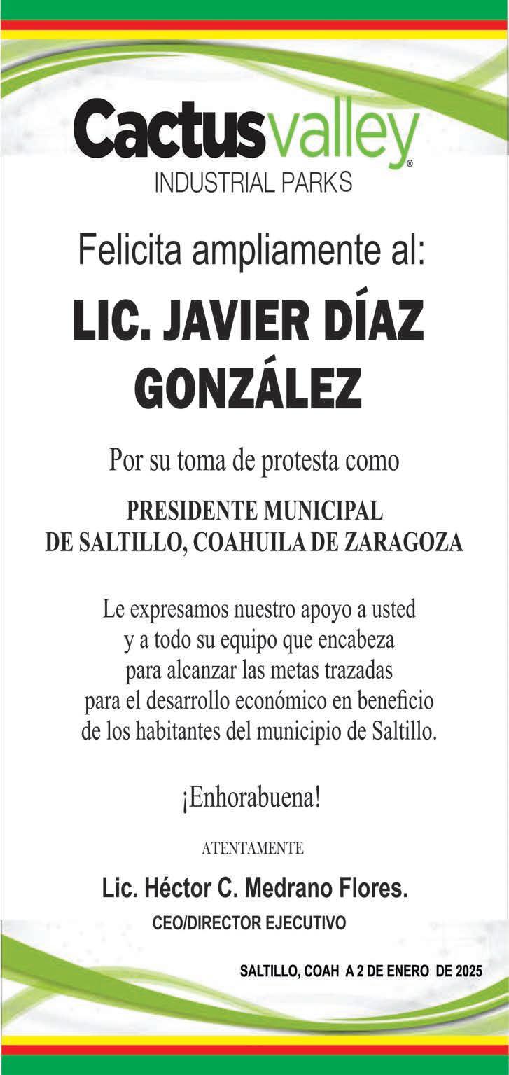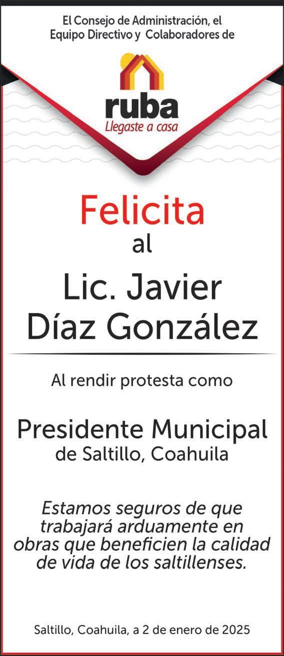 Buen arranque de gobierno tuvo el alcalde Javier Díaz González, quien delineó su dinámica de trabajo, que promete ser intensa. Durante la Toma de Protesta Ciudadana, el Munícipe dio un mensaje contundente con su eslogan Por Amor a Saltillo, que va mucho más allá de una frase, ya que es la visión de su gestión y demuestra el cariño que siente por esta ciudad. Díaz González también enfatizó que su Administración se regirá por los principios de transparencia, honestidad, responsabilidad y cercanía con la gente. A ello, sumará una coordinación total con el gobernador Manolo Jiménez, con quien hará equipo en materia de seguridad, competitividad y desarrollo social. Por cierto, estuvo muy bien arropado por la clase política y por la ciudadanía; hubo gran convocatoria.
