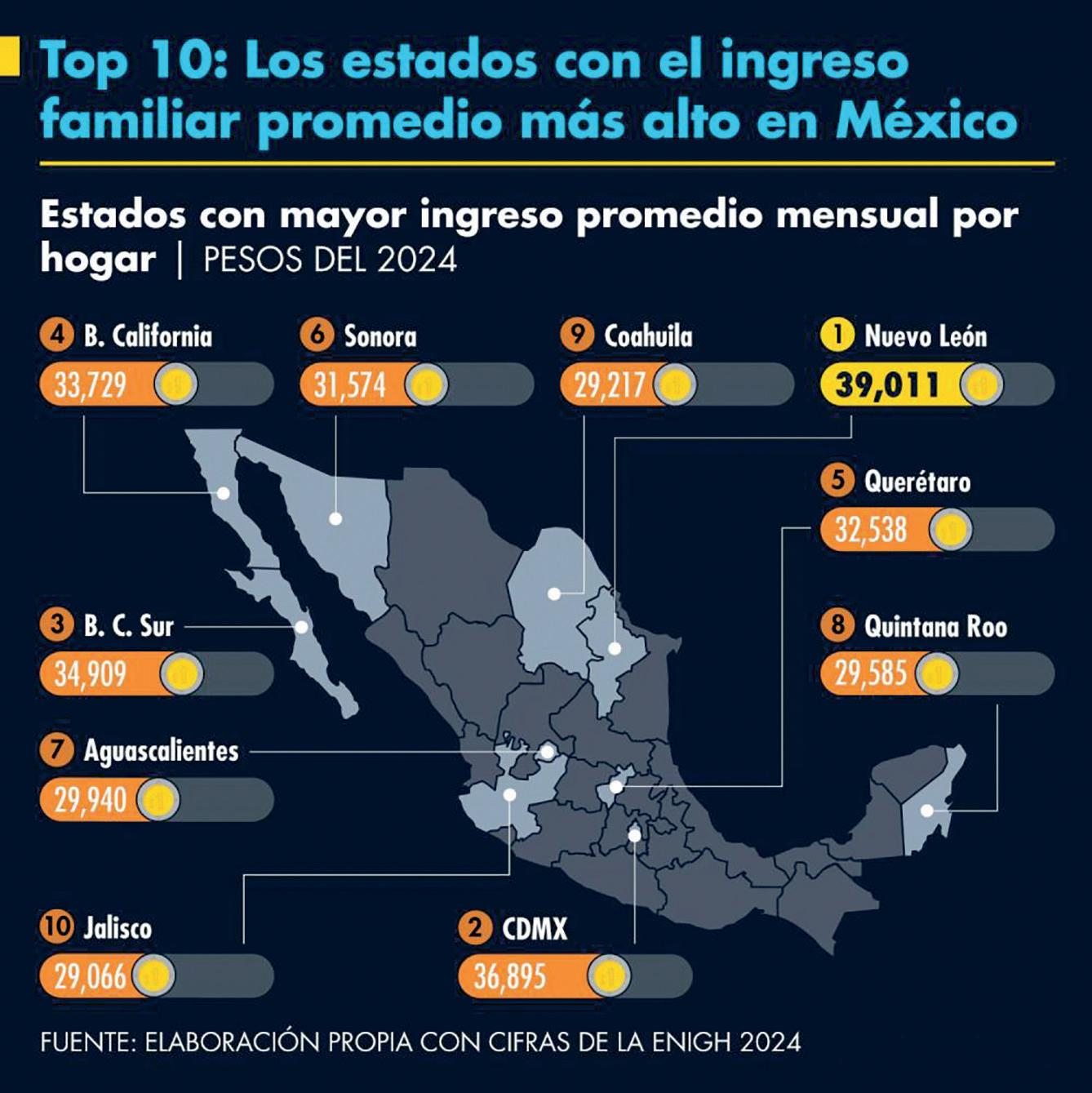 León fue la entidad con el ingreso medio familiar más alto: 39 mil 11 pesos mensuales. Esto es, casi tres veces más que el ingreso medio de los hogares en Chiapas, donde la cifra fue de 13 mil 965 pesos al mes. Otras de las entidades que presentaron un alto ingreso promedio por hogar son la Ciudad de México, Baja California Sur, Baja California, Querétaro y Sonora, con lo que se observa una tendencia importante de mayores ingresos en los estados que comparten frontera con Estados Unidos.