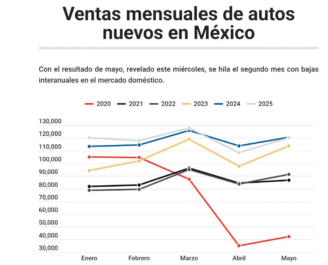 La tendencia negativa es perceptible en la comparación mensual, pues en mayo se vendieron 119 mil 961 vehículos nuevos, una ligera caída de 0.4% contra los 120 mil 452 autos vendidos en el mismo mes de 2024. De acuerdo con la Asociación Mexicana de Distribuidores de Automotores (AMDA), el mercado comienza a resentir los estragos de un menor dinamismo en la economía doméstica, pues mayo se convirtió en el segundo mes consecutivo con retrocesos en las ventas, ya que la tendencia ya se había anticipado en abril, cuando las ventas también se ubicaron por debajo de lo previsto -poco más de 108 mil unidades-, en parte por el efecto estacional de las vacaciones de Semana Santa. Pero más allá de estos factores temporales, la preocupación en el sector es más profunda. “Independientemente de la estacionalidad, se confirma la