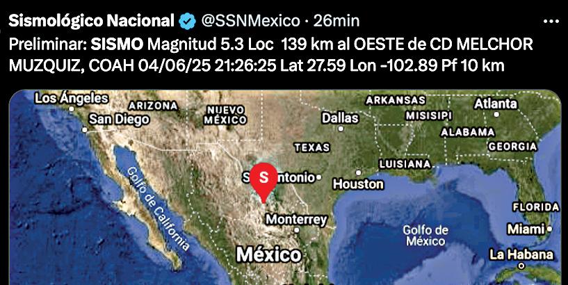 El movimiento tuvo su epicentro a 139 kilómetros al oeste de Múzquiz, a una profundidad de 10 kilómetros, aunque el anuncio preliminar indicaba una intensidad de 5.3 grados alrededor de las 21:26 horas.