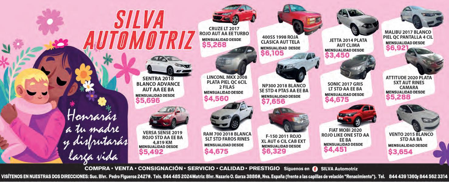 AUTOS CHEVROLET 400SS 1998 ROJA CAB SENCILLA AUT TELA MENSUAL DESDE $6,105.00 8444-39-13-60 AVEO LT 2018 AZUL STD AA EE BA ABS MENSUAL DESDE $4,471.00 844-439-1360 BEAT 2020 ROJO SEDAN STD AA EE BA MENSUAL DESDE $5,083 INFORMES AL 844-439-13-60 CAVALIER 2022 GRAFITO RS TURBO 3 CIL PIEL QC MENSUAL DESDE $8,146 844-43913-60 CAVALIER LS 2019 ROJO AUT AA EE BA TELA MENSUAL DESDE $5,084.00 844-439-13-60 CRUZE 2016 ROJO LS AUT AA EE BA MENSUAL DESDE $4,451.00 844-439-1360 FOCUS 2014 ROJO LUXURY AUT PIEL MENSUAL DESDE $5,083 INFORMES AL 844-439-13-60 MALIBU 2017 BLANCO PIEL QC PANTALLA 4 CIL MENSUALIDAD DESDE $6921.00 844439-13-60 SONIC “A” 2017 TINTO STD AA EE BA 57,499 KM MENSUAL DESDE $4,185.00 844-439-1360 SONIC 2017 GRIS LT STD AA EE BA MENSUAL DESDE $4,675 AL 844-439-13-60 TRAVERS 2015 PLATA PIEL QC 3 FILAS CÁMARA MENSUALIDAD DESDE $7,125 844-439-13-60 TRAXX LT 2018 ROJA AUT AA EE BA PIEL MENSUAL DESDE $6,513.00 844-439-1360 FIAT FIAT MOBI 2020 GRIS OSCURO LIKE STD TELA 5 PTAS MENSUAL DESDE $4,328 844-439-13-60 NISSAN ALTIMA 2016 PLATA ADV NAVI AUT PIEL QC MENSUAL DESDE $5,900.00 844439-13-60 FRONTIER LE 2019 ROJA STD AA EE BA TELA TUMBABURROS MENSUAL DESDE $9,371 INFORMES 844-439-1360 KICKS 2019 ROJO AUT PIEL AA EE BA MENSUAL DESDE $7,942.00 844-43913-60 LINCONL