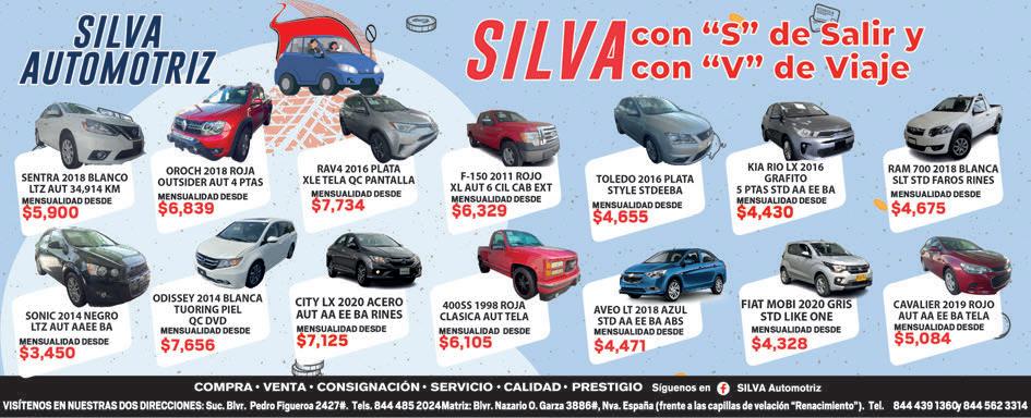 AUTOS CHEVROLET 400SS 1998 ROJA CAB SENCILLA AUT TELA MENSUAL DESDE $6,105.00 844-4-39-1360 ATTIUTUDE SXT 2020 GRAFITO STD AA EE BA PANTALLA MENSUAL DESDE $5,063 844-439-13-60 AVEO LT 2018 AZUL STD AA EE BA ABS MENSUAL DESDE $4,471.00 844-439-1360 CAVALIER 2022 GRAFITO RS TURBO 3 CIL PIEL QC MENSUAL DESDE $8,146 844439-13-60 CAVALIER LS 2019 ROJO AUT AA EE BA TELA MENSUAL DESDE $5,084.00 844-43913-60 MALIBU 2017 BLANCO PIEL QC PANTALLA 4 CIL MENSUALIDAD DESDE $6921.00 844439-13-60 MALIBU LT 2015 BLANCO AUT AA EE BA TEL 4 CIL MENSUAL DESDE$4,675 844-439-13-60 SENTRA 2018 BLANCO ADV AUT 34,914 KM MENSUAL DESDE $5,900 INFORMES AL 844-43913-60 SONIC 2017 GRIS LT STD AA EE BA MENSUAL DESDE $4,675 AL 844439-13-60 SPARK 2017 BLACK LTZ STD PANTALLA MENSUAL DESDE $4,450 INFORMES AL 844-43913-60 TRAXX LT 2018 ROJA AUT AA EE BA PIEL MENSUAL DESDE $6,513.00 844-43913-60 FIAT FIAT MOBI 2020 GRIS OSCURO LIKE STD TELA 5 PTAS MENSUAL DESDE $4,328 844-439-13-60 FORD FOCUS 2016 SE LUXURY, DE COCHERA, PI EL ELECTRICO QUEMACOCOS, SEMINUEVO, GU IN DA 44,000 KM UN SO LO DUEÑO, AUTOMATICO. 84 42 69 12 56 FUSION 2017 GRIS IMAN SE AUT PIEL QC CÁMARA MENSUALIDAD DESDE $7,350 AL 844-439-13-60 XT5 CADILLAC 2017 NEGRO PIEL QC CÁMARA 6 CIL MENSUAL DESDE $9.902 AL 844-439-13-60 NISSAN FRONTIER LE 2019 ROJA STD AA EE BA TELA TUMBABURROS MENSUAL DESDE $9,371 INFORMES 844439-13-60 KICKS 2019 ROJO AUT PIEL AA EE BA MENSUAL DESDE $7,942.00 844-439-1360 LINCONL MKX 2008 PLATA PIEL QC 6 CIL 2 FILAS MESUALIDAD DESDE $4,560 INFORMES 844-43913-60 MARCH 2018 BLANCO ADVANCE STD AA EE MENSUAL DESDE $4,675 INFORMES AL 844-43913-60 NEON SE 2020 BLANCO AUT AA EE BA TELA MENSUAL DESDE $5,839.00 INFORMES 844-439-13-60 SENTRA 2018 BLANCO ADVENCE AUT AC EE BA MENSUAL DESDE $5,696.00 844-439-1360 SONIC 2014 NEGRO LTZ AUT AA EE BA MENSUAL DESDE 3,450 INFORMES AL 844-439-13-60 VERSA ADVENCED 2016 ROJO STD AA EE BA CÁMARA RINES MENSUAL DESDE $5,492 INFORMES 844439-13-60 SEAT IBIZA 2018 BLANCA REFERENCE STD QC MENSUAL DESDE $5,900.00 844-439-1360 VOLKSWAGEN JETTA 2013 PLATA CL STD CLIMA MENSUAL DESDE $3,450 INFORMES AL 844-439-13-60 SCALA 2012 BLANCO STD AA EE BA MENSUAL DESDE