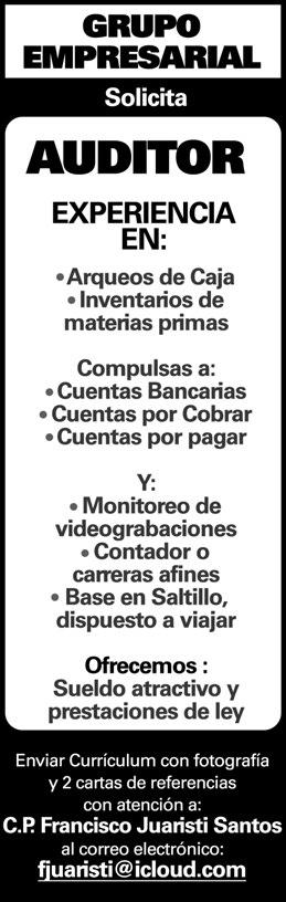 .EMPRESA IMPORTANTE SOLICITA SEPULTUREROS Y AUXILIAR DE LIMPIEZA, PARA PARQUE FUNERARIO, SEXO MASCULINO MAYOR DE 28 AÑOS, CON DISPONIBILIDAD DE HORARIO Y ACTITUD DE SERVICIO. INTERESADOS PRESENTARSE EN MIGUEL HIDALGO #1228, CASI ESQUINA CON FRANCISCO COSS O COMUNICARSE AL 844-27784-70 Y 844-414-444-85. ENTREVISTAS DE LUNES A VIERNES DE 9;00A 1;00 PM Y DE 4;00 A 6;00 PM. OFRECEMOS