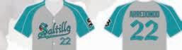 Oxford o gris oscuro z Este color, de acuerdo con la presentación, por el orgulloso de nuestras raíces y como tributo a la ciudad natal del equipo Saraperos. z La casaca gris oxford va con la leyenda Saltillo en el pecho justo en el corazón, con letras en color negro y con vivos en color aqua. z Los patrocinadores aparecerán en color aqua. z Se usará especialmente para juegos de gira.
