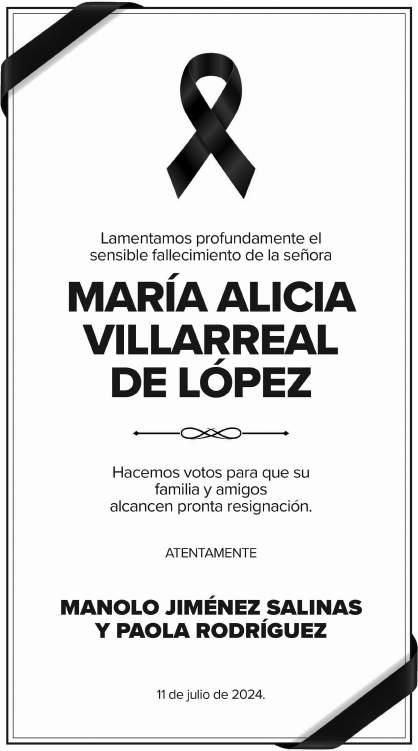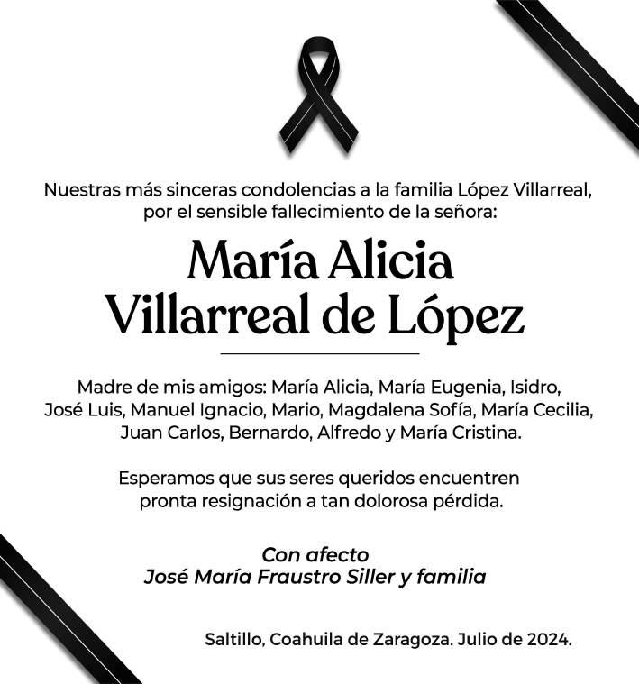 La sociedad saltillense ha perdido a una de las mujeres más distinguidas, altruista e influyente de la Iniciativa Privada y madre de dos exalcaldes. Amigos y familiares lamentaron el deceso de María Alicia Villarreal de López, a los 92 años. Los servicios fúnebres se realizarán hoy, de 10:00 a 13:00 horas, en las capillas Renacimiento, y la misa de cuerpo presente será a las 17:00 horas en el mismo recinto. z