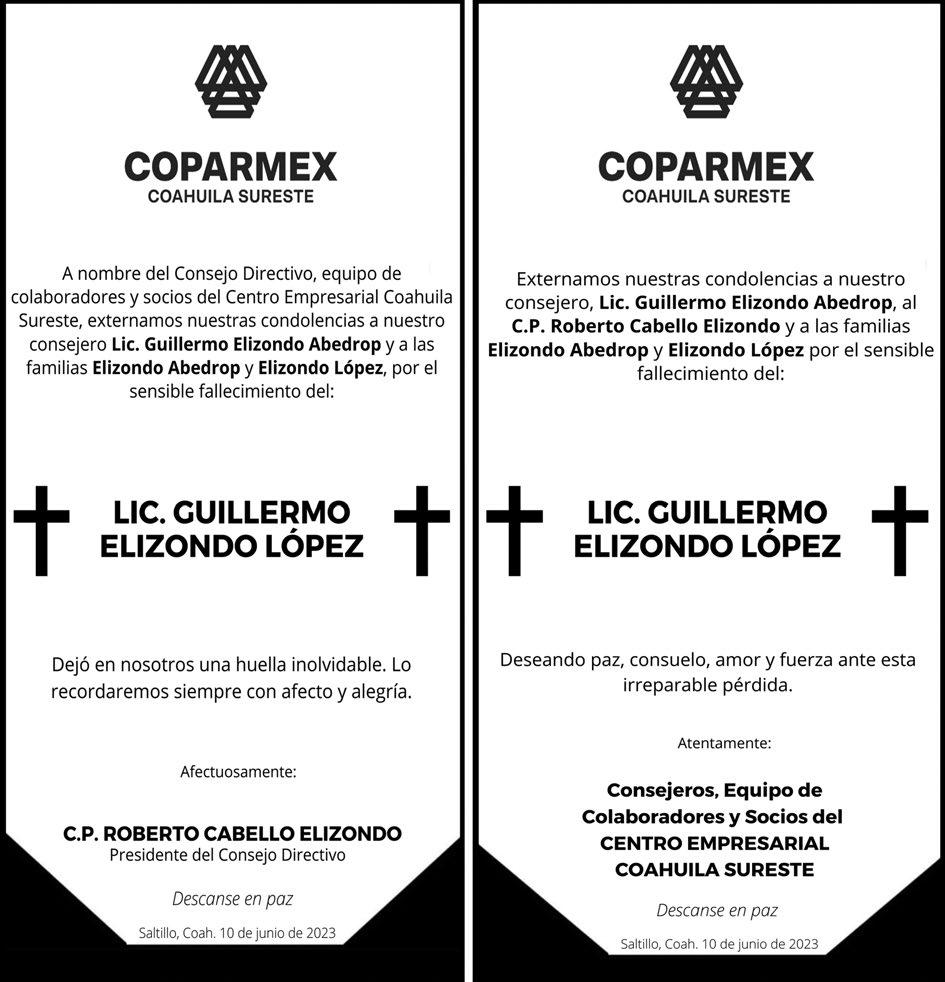 Don Guillermo era socio y accionista del Grupo Industrial Saltillo, del Hospital Christus Muguerza, del Hotel Quinta Real, y del Consejo de Desarrollo Inmobiliario Elabe del Norte. Era hijo de don Guillermo Elizondo Garza (QEPD) y doña Ana María López del Bosque de Elizondo (QEPD). Enorme pérdida Ante tan lamentable pérdida, el también empresario Víctor Mohamar Abugaber, comentó “con la partida de Guillermo pierde Saltillo a un gran hombre, que se caracterizaba por su don de gente, su amistad sincera e incondicional, su visión y certeza empresarial, pero su más grande cualidad era que nunca negaba el apoyo a la gente necesitada, o bien a las grandes obras en beneficio de la comunidad.