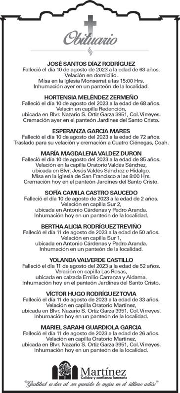.EMPRESA FUNERARIA SOLICITA ENCARGADA DE CAPILLA Y CHOFER PARA CARROZA DE 30 A 58 AÑOS, DISPONIBILIDAD DE HORARIO . INTERESADOS PRESENTARSE EN MIGUEL HIDALGO #1228, CASI ESQUINA CON FRANCISCO COSS O COMUNICARSE AL 844277-84-70 Y 844-414-44-85. ENTREVISTAS DE LUNES A VIERNES DE 9;00 A 1;00 PM Y DE 4;00 A 6;00 PM. OFRECEMOS PAGO SEMANAL, VALES DE DESPENSA Y PRESTACIONES DE LEY, CONTRATACION INMEDIATA, PRESENTARSE CON PAPELERIA OFICIAL