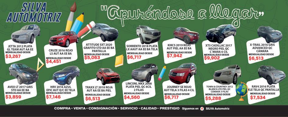 AUTOS CHEVROLET 400SS 1998 ROJA CAB SENCILLA AUT TELA MENSUAL DESDE $6,105.00 844-4-39-1360 ATTIUTUDE SXT 2020 GRAFITO STD AA EE BA PANTALLA MENSUAL DESDE $5,063 844-439-13-60 AVEO LT 2017 GRIS STD AA EE BA MENSUAL DESDE $3,859 INFORMES AL 844439-13-60 AVEO LT 2018 AZUL STD AA EE BA ABS MENSUAL DESDE $4,471.00 844-439-1360 CAVALIER 2022 GRAFITO RS TURBO 3 CIL PIEL QC MENSUAL DESDE $8,146 844439-13-60 CAVALIER LS 2019 ROJO AUT AA EE BA TELA MENSUAL DESDE $5,084.00 844-43913-60 MALIBU 2017 BLANCO PIEL QC PANTALLA 4 CIL MENSUALIDAD DESDE $6921.00 844439-13-60 MALIBU LT 2015 BLANCO AUT AA EE BA TEL 4 CIL MENSUAL DESDE$4,675 844-439-13-60 SENTRA 2018 BLANCO ADV AUT 34,914 KM MENSUAL DESDE $5,900 INFORMES AL 844-439-13-60 SONIC 2017 GRIS LT STD AA EE BA MENSUAL DESDE $4,675 AL 844-439-13-60 SPARK 2017 BLACK LTZ STD PANTALLA MENSUAL DESDE $4,450 INFORMES AL 844-439-13-60 TRAXX LT 2018 ROJA AUT AA EE BA PIEL MENSUAL DESDE $6,513.00 844-43913-60 FIAT FIAT MOBI 2020 GRIS OSCURO LIKE STD TELA 5 PTAS MENSUAL DESDE $4,328 844-439-13-60 FORD FOCUS 2016 SE LUXURY, DE COCHERA, PI EL ELECTRICO QUEMACOCOS, SEMINUEVO, GU IN DA 44,000 KM UN SO LO DUEÑO, AUTOMATICO. 84 42 69 12 56 FUSION 2017 GRIS IMAN SE AUT PIEL QC CÁMARA MENSUALIDAD DESDE $7,350 AL 844-439-13-60 XT5 CADILLAC 2017 NEGRO PIEL QC CÁMARA 6 CIL MENSUAL DESDE $9.902 AL 844-439-13-60 NISSAN FRONTIER LE 2019 ROJA STD AA EE BA TELA TUMBABURROS MENSUAL DESDE $9,371 INFORMES 844439-13-60 KICKS 2019 ROJO AUT PIEL AA EE BA MENSUAL DESDE $7,942.00 844-439-13-60 LINCONL MKX 2008 PLATA PIEL QC 6 CIL 2 FILAS MESUALIDAD DESDE $4,560 INFORMES 844-439-13-60 MARCH 2018 BLANCO ADVANCE STD AA EE MENSUAL DESDE $4,675 INFORMES AL 844-439-13-60 NEON SE 2020 BLANCO AUT AA EE BA TELA MENSUAL DESDE $5,839.00 INFORMES 844-439-1360 SENTRA 2018 BLANCO ADVENCE AUT AC EE BA MENSUAL DESDE $5,696.00 844-439-1360 VERSA ADVENCED 2016 ROJO STD AA EE BA CÁMARA RINES MENSUAL DESDE $5,492 INFORMES 844439-13-60 SEAT IBIZA 2018 BLANCA REFERENCE STD QC MENSUAL DESDE $5,900.00 844-439-1360 VOLKSWAGEN JETTA 2012 PLATA GL TEAM AUT AA EE MENSUAL DESDE $3,267 INFORMES AL 844-439-13-60 JETTA 2013 PLATA CL STD CLIMA MENSUAL DESDE $3,450 INFORMES AL 844439-13-60 SCALA 2012 BLANCO STD AA EE BA MENSUAL DESDE $ INFORMES AL 844-439-1360 SORRENTO 2018 PLATA LX AUT TELA CAMARA MENSUAL DESDE $7,717 INFORMES AL 844-439-13-60 OTROS AQUI COMPRAMOS CARROS PARA DESARMAR. 844-285-99-68 COMPRO CARROS PARA DESARMAR, INFORMES AL 844-31110-96 y 844-290-16-81 HRV 2016 AZUL EPIC AUT Q/C EE TELA MENSUAL DESDE $7,146 INFORMES AL 844-439-13-60 ATTITUDE 2017 PLATA SE STD AA BA MESNUALIDAD DESDE $4,063.00 844-43913-60 ATTITUDE 2020 PLATA SXT AUT RINES CAMARA MENSUAL DESDE $5,288.00 AL 844-439-13-60 SUV Y PICK UP CHRYSLER TOWN & COUNRY 2011 BLANCA LTD PIEL QC CÁMARA 3 FILAS MENSUALIDAD DESDE $5,206.00 844-439-13-60 FORD F-150 2011 ROJO XL AUT 6 CIL CAB EXT MENSUAL DESDE $5,6,105.00 844-43913-60 MAZDA MAZDA CX-9 2009 ALUMINIO 3 FILAS PIEL QC DVD MENSUAL DESDE $5,696.00 844-439-13-60 NISSAN NP300 2018 BLANCA SE STD 4 PTAS AA EE BA MENSUAL DESDE $7,656.00 844-43913-60 DODGE CAVALIER 2020 BLANCO PREMIER AUT PIEL QC MENSUALIDAD DESDE $6,513.00 844-439-13-60 JOURNEY 2016 BLANCA SXT 4 CIL 3 FILAS TELA MENSUAL DESDE $6,738 844-439-13-60 JOURNEY 2022 NEGRO TURBO PIEL QC 2 FILAS MENSUALIDAD DESDE $12,209 844-439-13-60 RAM 700 2017 ROJA CAB SEN STD AA EE BA MENSUAL DESDE $4,675 844-43913-60 RAV4 2016 PLATA XLE TELA QC PANTALLA MENSUAL DESDE $7,534.00 844-43913-60 TOWN &COUNTRY 2012 BLANCO PIEL QC 3 FILAS PANTALLA MENSUAL DESDE $5,819 844-439-13-