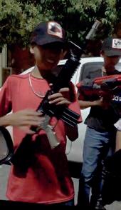 Con rifles de juguete, uno que emite el inconfundible sonido de las ráfagas, y otro sin gatillo, los pequeños detienen a los autos que transitan por la calle Juan Carlos II para preguntarles a dónde van y si traen cerveza o droga.