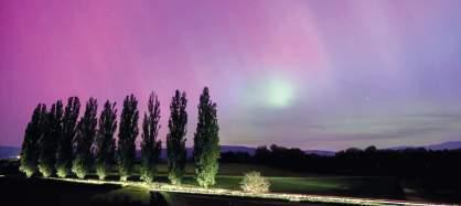 z Este año el Sol registra un máximo de actividad en un ciclo de 11 años, y este mes de mayo, por estar cerca del equinoccio, es cuando debido al eje de giro del planeta se produce mayor penetración de viento solar en la magnetosfera terrestre. alcanza casi 5 mil 600 Celsius). Estas manchas nos indican en qué partes afloran a la superficie las líneas de campos magnéticos solares. De estas manchas se desprenden ocasionalmente ráfagas de partículas. Las más concentradas y de corta duración, se llaman fulguraciones, y las más potentes y extendidas, son las emisiones coronales masivas. También es común ver que los lazos magnéticos entre manchas arrastran hidrógeno excitado de la cromosfera solar, formando protuberancias o prominencias (como las que se vieron de color rojo en el eclipse total de Sol). Esta semana el Sol exhibió un complejo de manchas enormes, tan grande como 15 tierras en hilera, y de ese gran conjunto, se desprendieron al menos cinco emisiones coronales y fulguraciones, una tras otra. Al llegar a la Tierra, tras cruzar 150 millones de kilómetros, esa ráfaga de partículas cargadas empezó a interactuar con el campo magnético de la Tierra y a perturbarlo. La lluvia de partículas cargadas en la alta atmósfera (a una altura aproximada de 300 a 800 km) excita el oxígeno, haciéndolo brillar en rojo. A menor altura, de 120 a 300 km sobre la superficie de la Tierra, donde la presión atmosférica es mayor, el oxígeno excitado brilla en color verde-dorado. El nitrógeno atmosférico que se excita (se ioniza) brilla en color