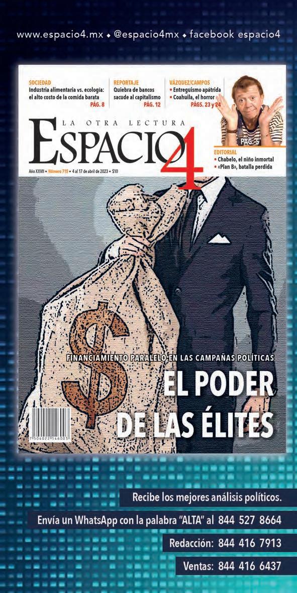 Y si bien AMLO aseguró que Estados Unidos devolverá el dinero, no contaba con que el gobernador Mi- guel Ángel Riquelme saldría al paso para refrescar la memoria y advertir que lo confiscado habría salido de Coahuila y, por lo tanto, se debía reintegrar a Coahuila. Por cierto, en Coahuila hay tres procesos penales pendientes contra Javier Villarreal, dos de ellos con orden de aprehensión.