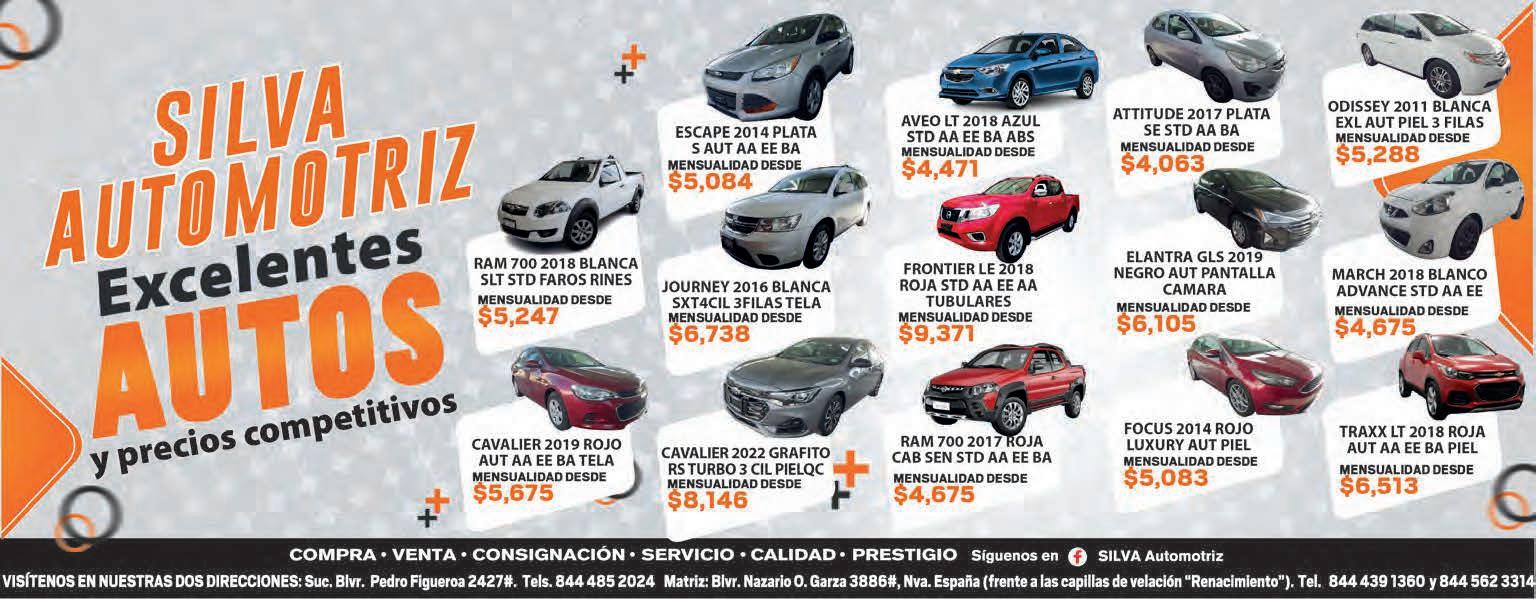 AUTOS CHEVROLET 400SS 1998 ROJA CAB SENCILLA AUT TELA MENSUAL DESDE $6,105.00 844-4-39-1360 AVEO LT 2018 AZUL STD AA EE BA ABS MENSUAL DESDE $4,471.00 844-439-13-60 BEAT 2020 ROJO SEDAN STD AA EE BA MENSUAL DESDE $5,083 INFORMES AL 844-43913-60 CAVALIER 2022 GRAFITO RS TURBO 3 CIL PIEL QC MENSUAL DESDE $8,146 844-439-13-60 CAVALIER 220 BLANCO PREMIER AUT PIEL QC MENSUALIDAD DESDE $6,697 INFORMES AL 844-439-13-60 CAVALIER LS 2019 ROJO AUT AA EE BA TELA MENSUAL DESDE $5,084.00 844-439-13-60 CRUZE 2016 ROJO LS AUT AA EE BA MENSUAL DESDE $4,451.00 844-439-13-60 FOCUS 2014 ROJO LUXURY AUT PIEL MENSUAL DESDE $5,083 INFORMES AL 844-439-13-60 MALIBU 2017 BLANCO PIEL QC PANTALLA 4 CIL MENSUALIDAD DESDE $6921.00 844439-13-60 SONIC “A” 2017 TINTO STD AA EE BA 57,499 KM MENSUAL DESDE $4,185.00 844-439-13-60 SONIC 2017 GRIS LT STD AA EE BA MENSUAL DESDE $4,675 AL 844-439-13-60 TRAVERS 2015 PLATA PIEL QC 3 FILAS CÁMARA MENSUALIDAD DESDE $7,125 844-43913-60 TRAXX LT 2018 ROJA AUT AA EE BA PIEL MENSUAL DESDE $6,513.00 844-439-13-60 FIAT FIAT MOBI 2020 GRIS OSCURO LIKE STD TELA 5 PTAS MENSUAL DESDE $4,328 844-43913-60 NISSAN ALTIMA 2016 PLATA ADV NAVI AUT PIEL QC MENSUAL DESDE $5,900.00 844-439-13-60 FRONTIER LE 2019 ROJA STD AA EE BA TELA TUMBABURROS MENSUAL DESDE $9,371 INFORMES 844-439-13-60 KICKS 2019 ROJO AUT PIEL AA EE BA MENSUAL DESDE $7,942.00 844-439-13-60 MARCH 2018 BLANCO ADVANCE STD AA EE MENSUAL DESDE $4,675 INFORMES AL 844-439-13-60 NEON SE 2020 BLANCO AUT AA EE BA TELA MENSUAL DESDE $5,839.00 INFORMES 844-439-13-60 SENTRA 2018 BLANCO ADVENCE AUT AC EE BA MENSUAL DESDE $5,696.00 844-439-1360 VERSA ADVENCED 2016 ROJO STD AA EE BA CÁMARA RINES MENSUAL DESDE $5,492 INFORMES 844-439-13-60 IBIZA 2018 BLANCA REFERENCE STD QC MENSUAL DESDE $5,900.00 844-439-13-60 VOLKSWAGEN JETTA 2014 PLATA AUT CLIMA MENSUAL DESDE $3,450 AL 844439-13-60 OTROS .AQUI COMPRAMOS CARROS PARA DESARMAR. 844-285-99-68 COMPRO CARROS PARA DESARMAR, INFORMES AL 844-311-1096 y 844-290-16-81 ELANTRA GLS 2019 NEGRO AUT PANTALLA CAMARA MENSUALIDAD $6,105.00 844-43913-60 ATTITUDE 2017 PLATA SE STD AA BA MESNUALIDAD DESDE $4,063.00 844-439-13-60 ATTITUDE 2020 PLATA SXT AUT RINES CAMARA MENSUAL DESDE $5,288.00 AL 844-43913-60 ATTITUDE SXT 2018 TINTO STD AA EE BA 46,301 KM MENSUAL DESDE $4,063 844-43913-60 CIVIC 2015 BLANCO EX TELA QC PANTALLA MENSUAL DESDE $5,288.00 AL 844-43913-60 SUV Y PICK UP CADILLAC CADILLAC SRX 2015 BLANCA PIEL QC FAROS CAMARA MENSUAL DESDE $7,145 844-439-13-60 CADILLAC SRX 2015 BLANCA PIEL QC FAROS CAMARA MENSUAL DESDE $7,350.00 844-439-13-60 CHRYSLER TOWN & COUNRY 2011 BLANCA LTD PIEL QC CÁMARA 3 FILAS MENSUALIDAD DESDE $5,206.00 844-439-13-60 FORD ESCAPE 2014 PLATA “S” AUT AA EE BA MENSUAL DESDE $5,084 844-439-13-60 EXPLORER 2013 BLANCA XLT 6 CIL TELA 3 FILAS MENSUALIDAD DESDE $6,104 844-43913-60 F-150 2011 ROJO XL AUT 6 CIL CAB EXT MENSUAL DESDE $5,6,105.00 844-439-1360 MAZDA MAZDA CX-9 2009 ALUMINIO 3 FILAS PIEL QC DVD MENSUAL DESDE $5,410 844-439-13-60 NISSAN NP300 2018 BLANCA SE STD 4 PTAS AA EE BA MENSUAL DESDE $7,656.00 844-439-13-60 DODGE CAVALIER 2020 BLANCO PREMIER AUT PIEL QC MENSUALIDAD DESDE $6,513.00 844439-13-60 JOURNEY 2016 BLANCA SXT 4 CIL 3 FILAS TELA MENSUAL DESDE $6,738 844-439-13-60 JOURNEY 2017 BLANCA GT 3 FILAS 6 CIL PIEL QC MENSUAL DESDE $7,758.00 844-439-13-60 JOURNEY 2022 NEGRO TURBO PIEL QC 2 FILAS MENSUALIDAD DESDE $12,209 844-439-13-60 RAM 700 2017 ROJA CAB SEN STD AA EE BA MENSUAL DESDE $4,675 844439-13-60 RAV4 2016 PLATA XLE TELA QC PANTALLA MENSUAL DESDE $7,534.00 844-43913-60 TOWN &COUNTRY 2012 BLANCO PIEL QC 3 FILAS PANTALLA MENSUAL DESDE $5,819 844-439-13-60 MINI VAN Y VANS HONDA ODISSEY 2011 BLANCA EXL AUT PIEL 3 FILAS MENSUAL DESDE $5,288.00 INFORMES AL 844-439-13-60 VENTA CASAS NORTE BONITA