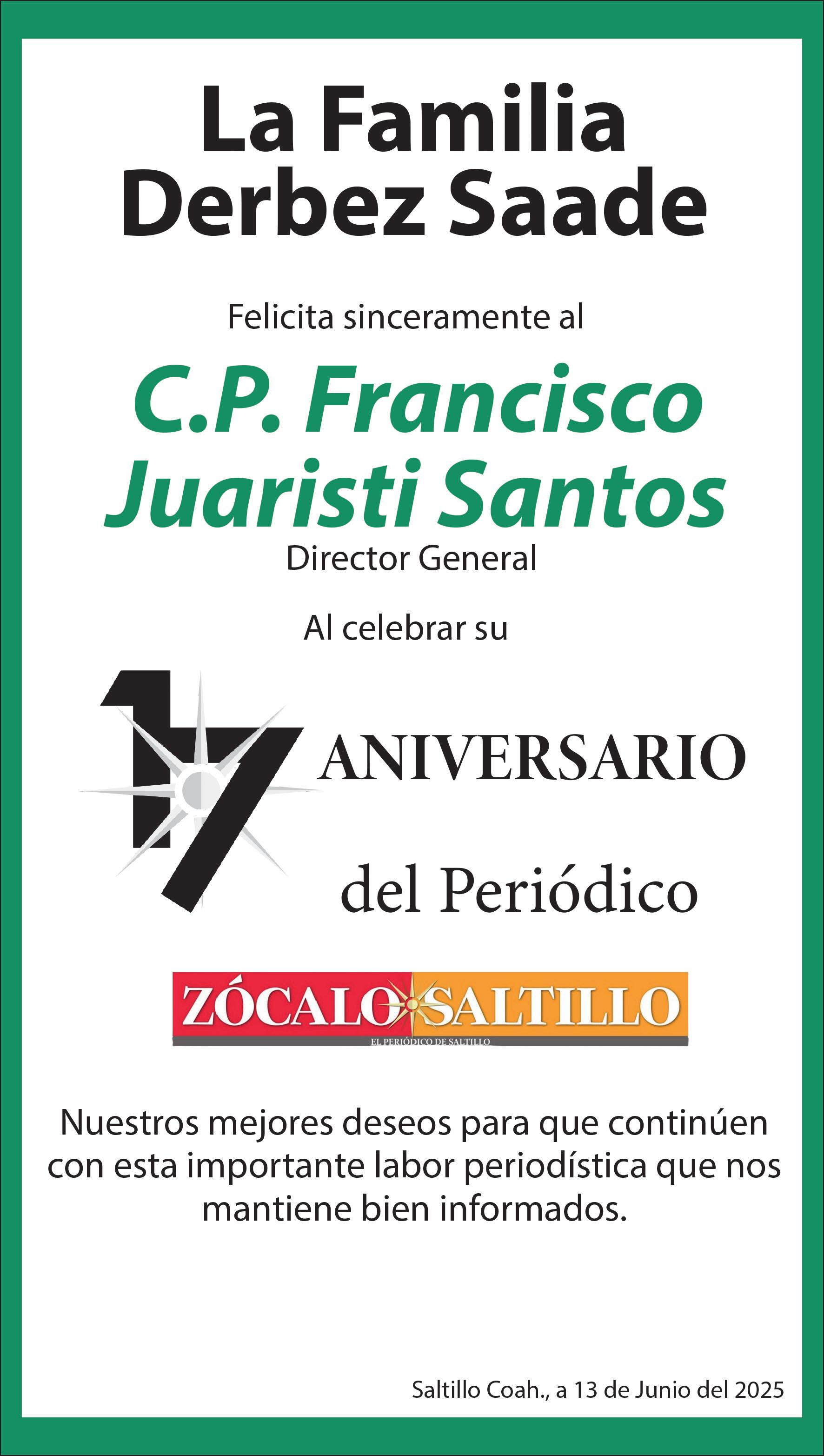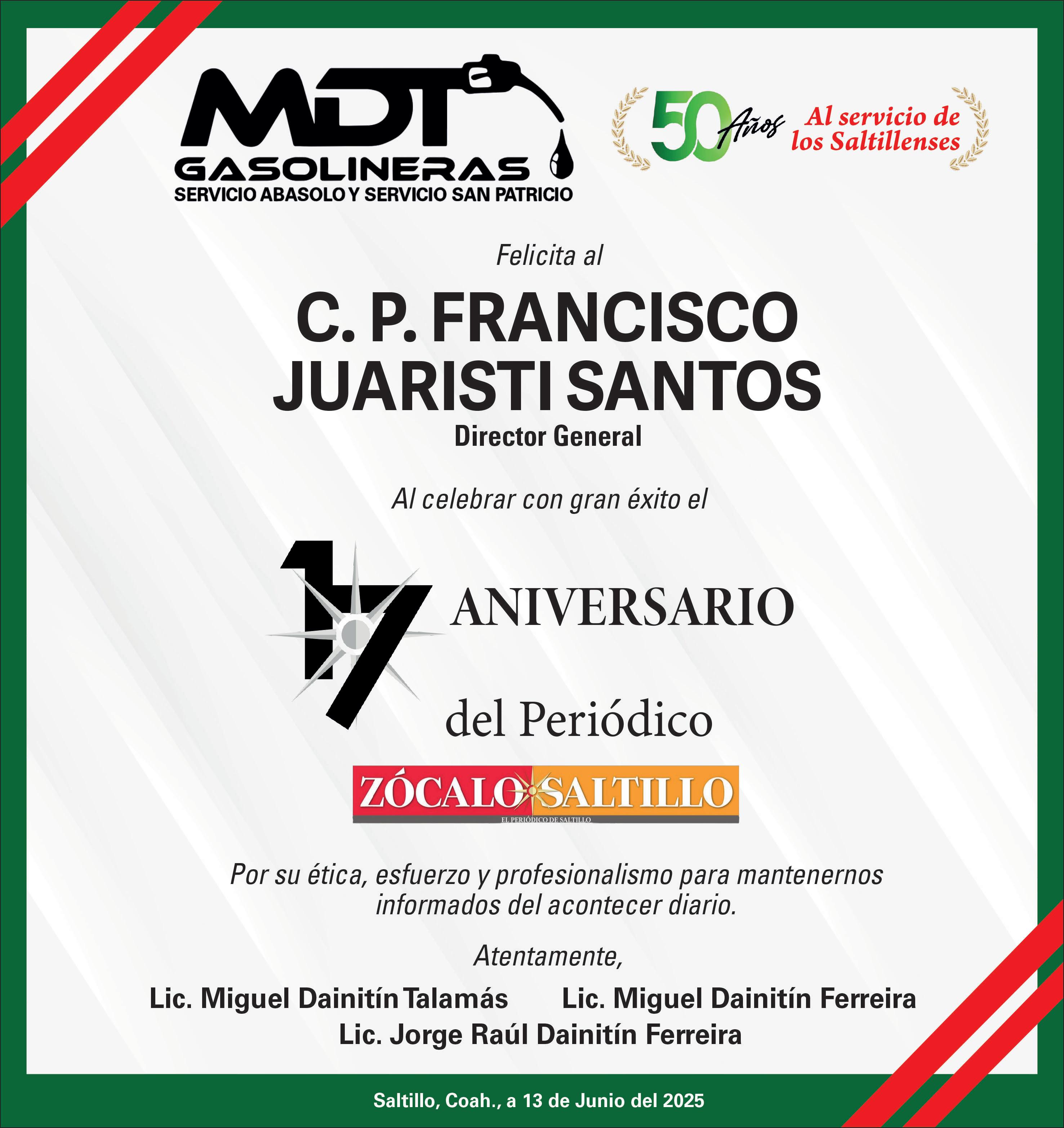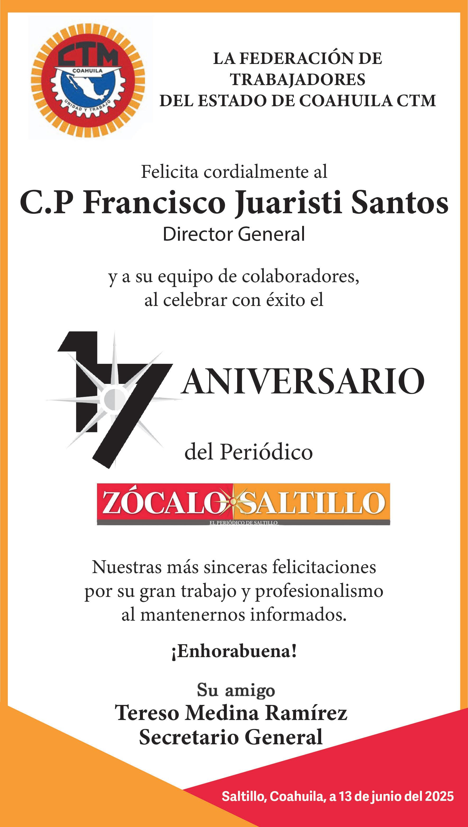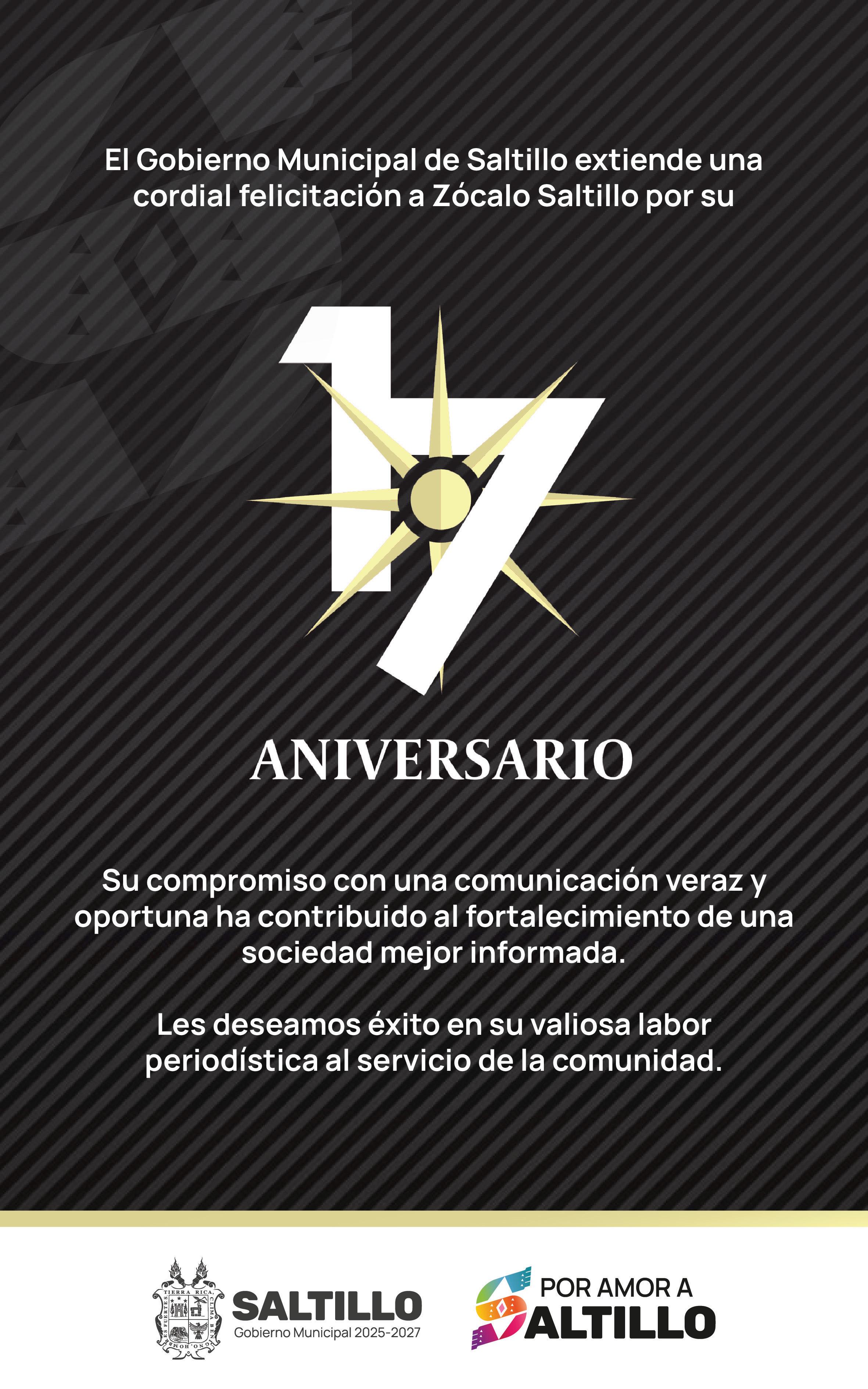 En estos primeros 17 años juntos, nuestros lectores en esta capital han conocido a Zócalo y Zócalo ha conocido a sus lectores, quienes valoran la información, el diseño y la pasión con las que diariamente hacemos estas páginas que se imprimen, porque todo lo importante se imprime para quedar en la historia de nuestra ciudad y nuestra gente. Gracias por su preferencia e invaluable confianza en periódico Zócalo Saltillo.