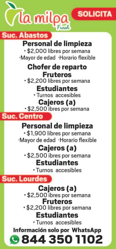 SADOS PRESENTARSE EN MIGUEL HIDALGO #1228, CASI ESQUINA CONFRANCISCOCOSS O COMUNICARSE AL 844-277-84-70 Y 844414-44-85. .EMPRESA IMPORTANTESOLICITASEPULTUREROSYAUXILIAR DE LIMPIEZA DE PARQUE FUNERARIO, SEXO MASCULINO MAYOR DE 28 AÑOS, CON DISPONIBILIDAD DE HORARIO Y ACTITUD DE SERVICIO. INTERESADOS PRESENTARSE EN MIGUEL HIDALGO #1228, CASI ESQUINA CONFRANCISCOCOSS O COMUNICARSE AL 844-414-44-85. AYUDANTE GENERAL, SEPA MANEJAR, PARA EMPRESA RAMO DEL ACERO, OFRECEMOS $1,750.00PORSEMANA, MASPRESTACIONESDE LEY, ESTAMOS CERCA DE LOS TERRENOS DE LA FERIATEL. 844-23101-39 INSTITUCION EDUCATIVA UBICADA AL NORTE DE SALTILLO SOLICITA AUXILIAR DE MANTENIMIENTO. PRESTACIONES SUPERIORES A LAS DE LEY, OFRECEMOS BUEN SUELDO, EXCELENTE AMBIENTE DE TRABAJO; REQUISITOS INDISPENSABLES CONOCIMIENTOS BASICOSDEPLOMERIA, ELECTRICIDAD Y REPARACIONES EN GENERAL; EDAD DE 35 A 55 AÑOS QUEVIVAAL NORTE DE SALTILLO O BIEN EN RAMOS ARIZPE, SOLICITUD PRINTAFORM, 2 CARTAS DE RECOMENDACION, INDISPENSABLE PRESENTARSEA ENTREVISTA. TELEFONOS: 844- 439-85-84 Y 844-439-87-75 EXT. 14 Y SOLO WHATSAPP844-159-95-77 MUEBLERIA AMBIANCE INTERIORES SOLICITA CHOFER PARA CARGA Y DESCARGA DE MUEBLES, AYUDANTE EN GENERAL Y VENDEDORADEPISO,MAYORDE EDAD.PRESENTAR SOLICITUDELABORADAEN RUFINO TAMAYO #320 ALPES NORTE. 844-48500-06EXT102 OPTICAS FRANKLIN POREXPANSION,SOLICITAOPTOMETRISTAY VENDEDOR FAVOR DE COMUNICARSEA LOS TELEFONOS 844-43182-24Y844-412-60-20. SESOLICITAAYUDANTE DE COCINA CON O SIN EXPERIENCIA LAVALOZAZONACENTRO GENERALCEPEDA351TEL 844-315-95-51 WHATSAPP844-174-54-23 SESOLICITAAYUDANTE DE COCINA CON O SIN EXPERIENCIA LAVALOZAZONANORTE COLOSIO2239INFORMESAL TEL 844-31595-51WHATSAPP 844174-54-23 ZAPATERIAS EL ZAPATON SOLICITA :VENDEDOR (A) Y ENCARGADO (A) MAYOR DE EDAD, APASIONADO DE LAS VENTAS, RESPONSABLE. DEJAR SOLICITUD ELABORADA EN SUCURSAL. CENTRAL. PERIFERICO LUIS ECHEVERRIA 335 LOC 6. TEL 871-59866-69 Ó ENVIAR CV. OFICINA.ZAPATON1@GMAIL.COM 6F Clasificados ZÓCALO SALTILLO Domingo 14 de abril de 2024 OTROS NISSAN INTENDENTES VARIOS
