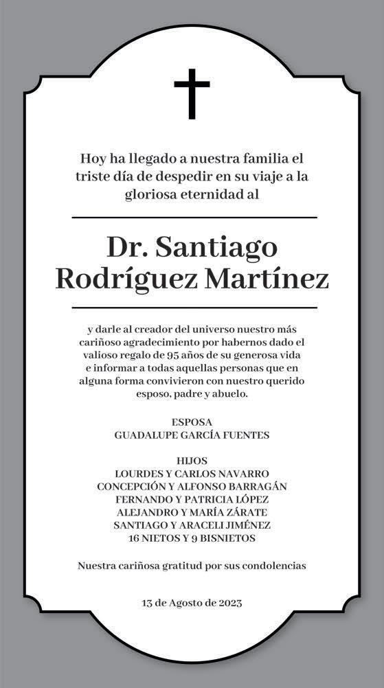 Hubo condolencias para la señora Paola Rodríguez López, esposa del Gobernador electo, Manolo Jiménez Salinas, por el fallecimiento de su abuelo, el doctor Santiago Rodríguez Martínez.
