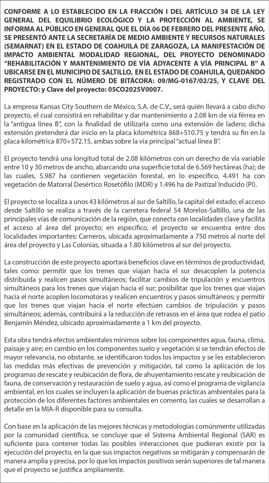 z Al calificar como positivo que el tren se detenga en Derramadero y Ramos Arizpe, el alcalde Javier Díaz González dijo que la próxima semana representantes del Gobierno federal vendrán a Coahuila para determinar por dónde pasaran las vías, una vez que ingresen a la ciudad, así como la ubicación de la estación. z “Otra cosa será la posibilidad de que pudiéramos aprovecharlo como un tren suburbano aquí en la Región Sureste… Van a venir la próxima semana para checar muy bien dónde va a ser el derecho de vía… porque, en primera instancia, ellos tenían la idea de que todavía el tren pudiera pasar por Emilio Carranza e Isidro López, y les dijimos que no, es prácticamente en medio de la ciudad”.