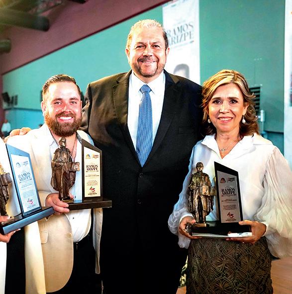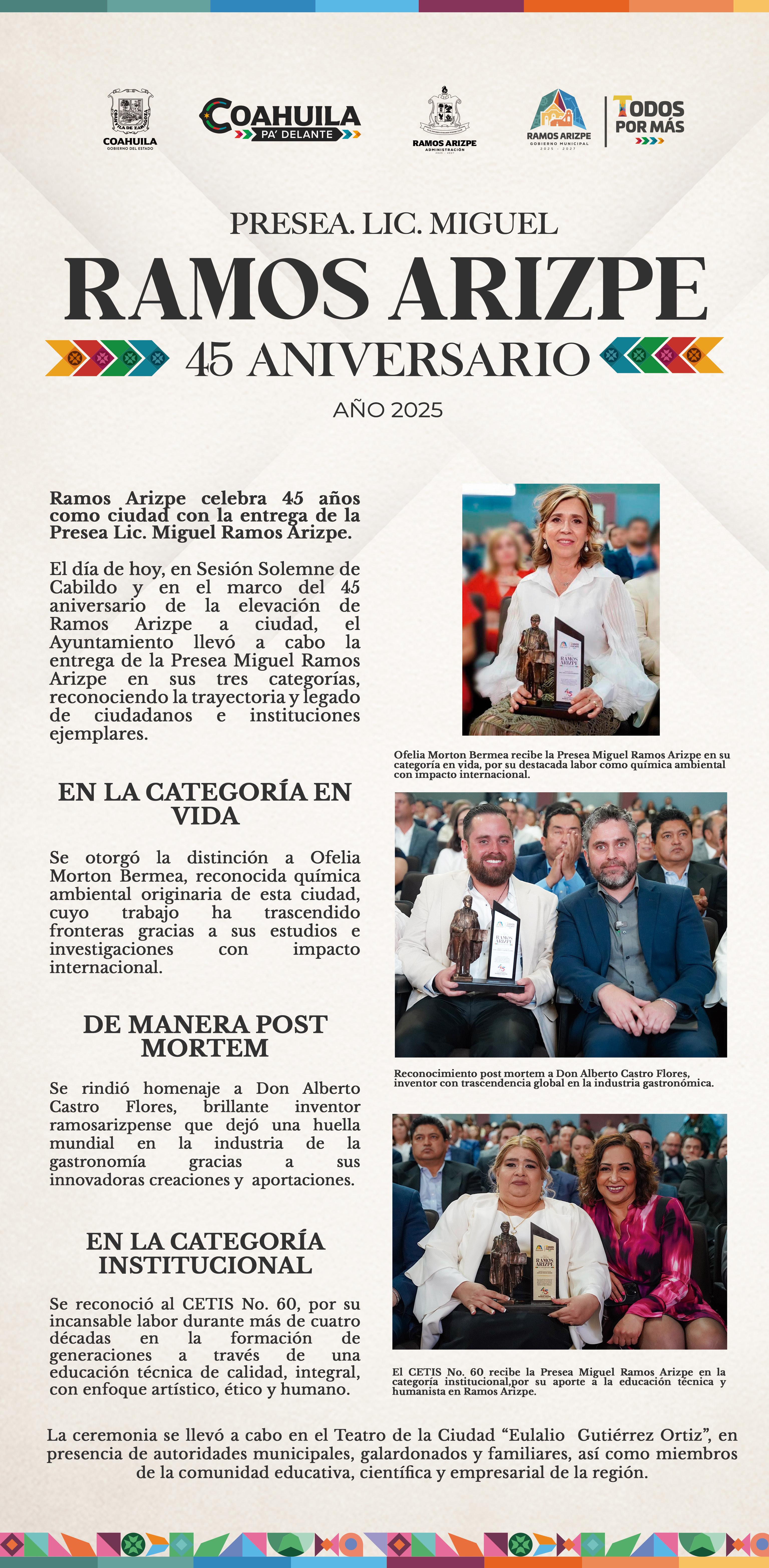 Durante la conmemoración del 45 aniversario de la elevación a ciudad, en sesión solemne de Cabildo se entregó el máximo galardón ramosarizpense En Vida a Ofelia Morton Bermea, por su contribución a la investigación científica; de manera Post Mortem a Alberto Castro Flores, por su legado para la industria gastronómica, y en la categoría Institucional al Cetis 60, que fue recibido por su directora, Diana María Meléndez.