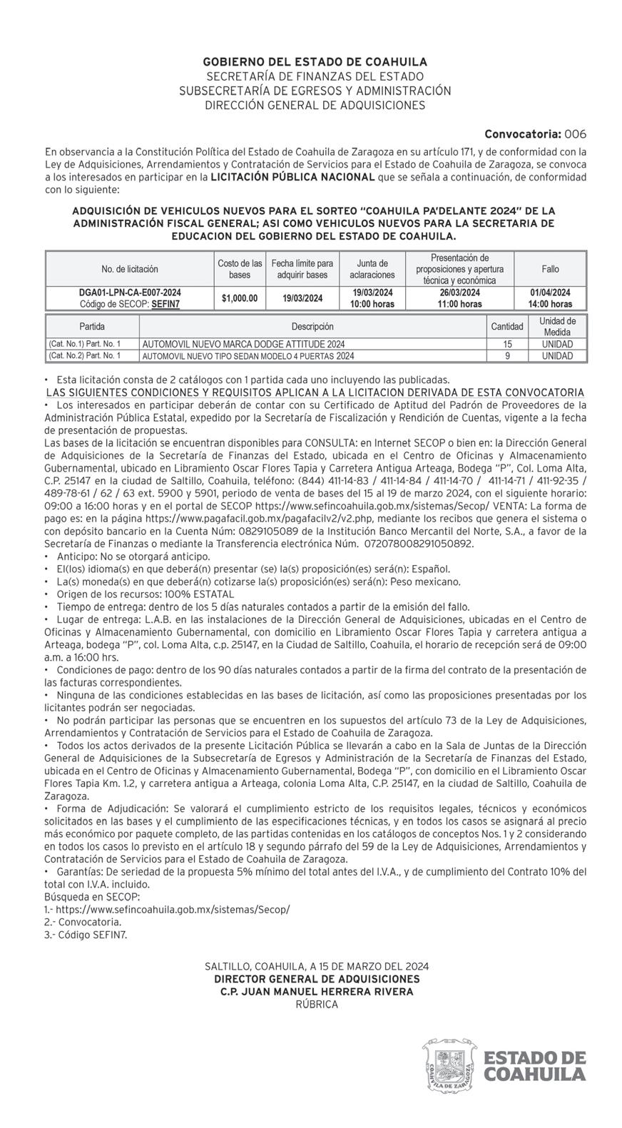 INTERESADOS PRESENTARSE EN MIGUEL HIDALGO #1228, CASI ESQUINA CON FRANCISCO COSS O COMUNICARSE AL 844-27784-70 Y 844-414-44-85