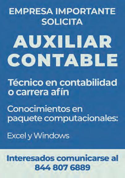 .EMPRESA IMPORTANTE SOLICITA AUXILIAR CONTABLE, EXPERIENCIA EN CONTABILIDAD, MANEJO DE OFFICE, TECNICO O CARRERA TRUNCA EN CONTABILIDAD O A FIN.. INTERESADOS PRESENTARSE EN MIGUEL HIDALGO #1228, CASI ESQUINA CON FRANCISCO COSS O COMUNICARSE AL 844 41444 85. ENTREVISTAS DE LUNES A VIERNES DE 9;00 A 1;00