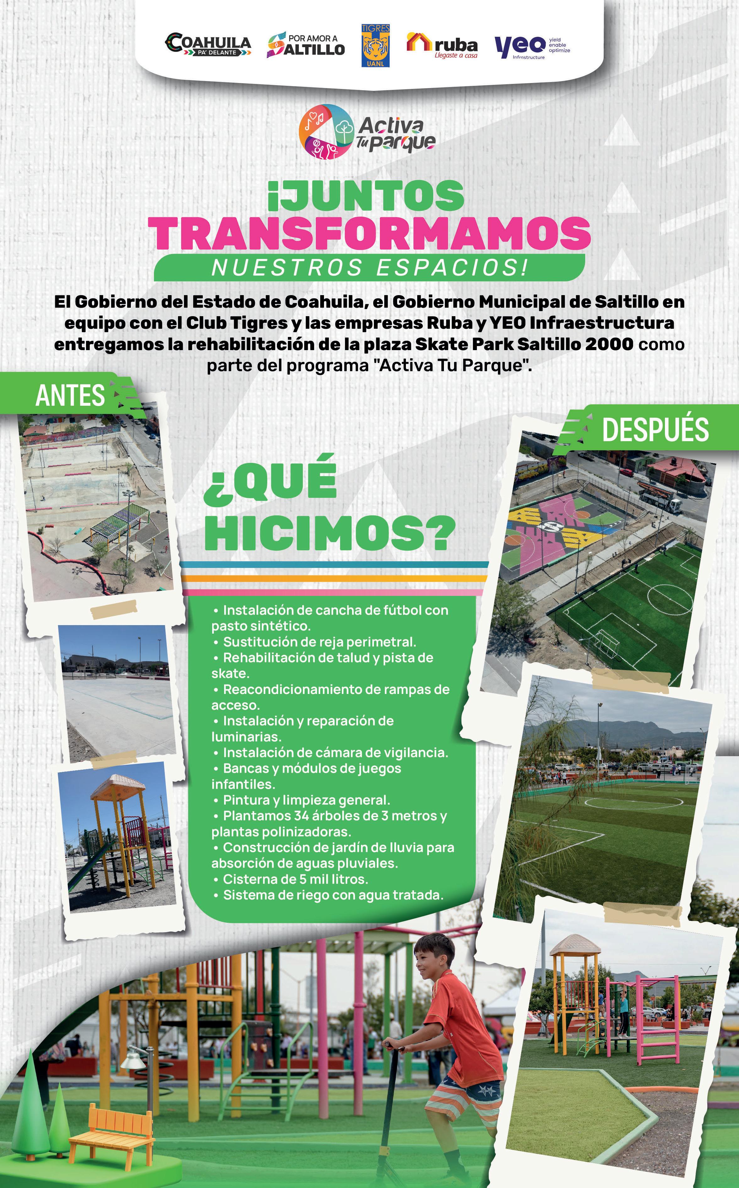 Le quedó al puro centavo el Skate Park Saltillo 2000 al alcalde Javier Díaz González, el tercero de Activa tu Parque que se ha logrado con la suma de esfuerzos del Gobierno del Estado, Municipio e iniciativa privada.