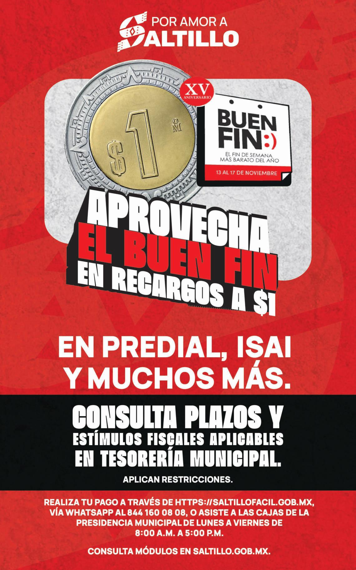 ron en la regulación del tráfico vehicular, que se vio retado por la alta concentración de visitantes, muchos provenientes de municipios cercanos como Ramos Arizpe y Arteaga. Pese al flujo intenso, los operativos permitieron mantener el orden y asegurar que la experiencia de compra transcurriera con relativa fluidez. Con tiendas llenas a más no poder, calles rebosantes y un ambiente de consumo que tomó la ciudad por completo, El Buen Fin volvió a demostrar el peso económico y social que tiene para Saltillo. Un fin de semana en el que el comercio local se movió con fuerza… y la gente también.