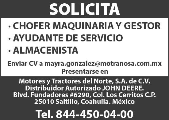 .EMPRESA IMPORTANTE SOLICITA AUXILIAR DE ALMACEN,, ENCARGADO DE TALLER Y PULIDOR DE MARMOL, SEXO MASCULINO MAYOR DE 28 AÑOS, CON DISPONIBILIDAD DE HORARIO Y ACTITUD DE SERVICIO. INTERESADOS PRESENTARSE EN MIGUEL HIDALGO #1228, CASI ESQUINA CON FRANCISCO COSS O COMUNICARSE AL 844-277-84-70 Y 844414-44-85.